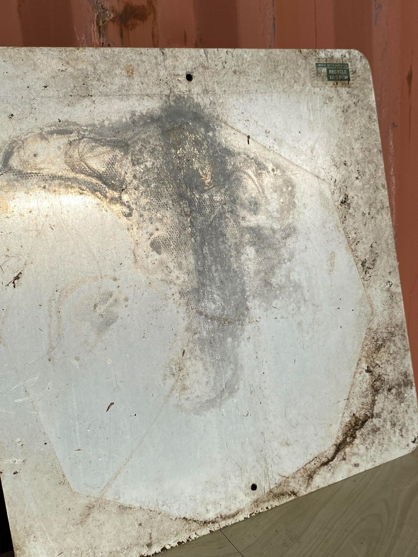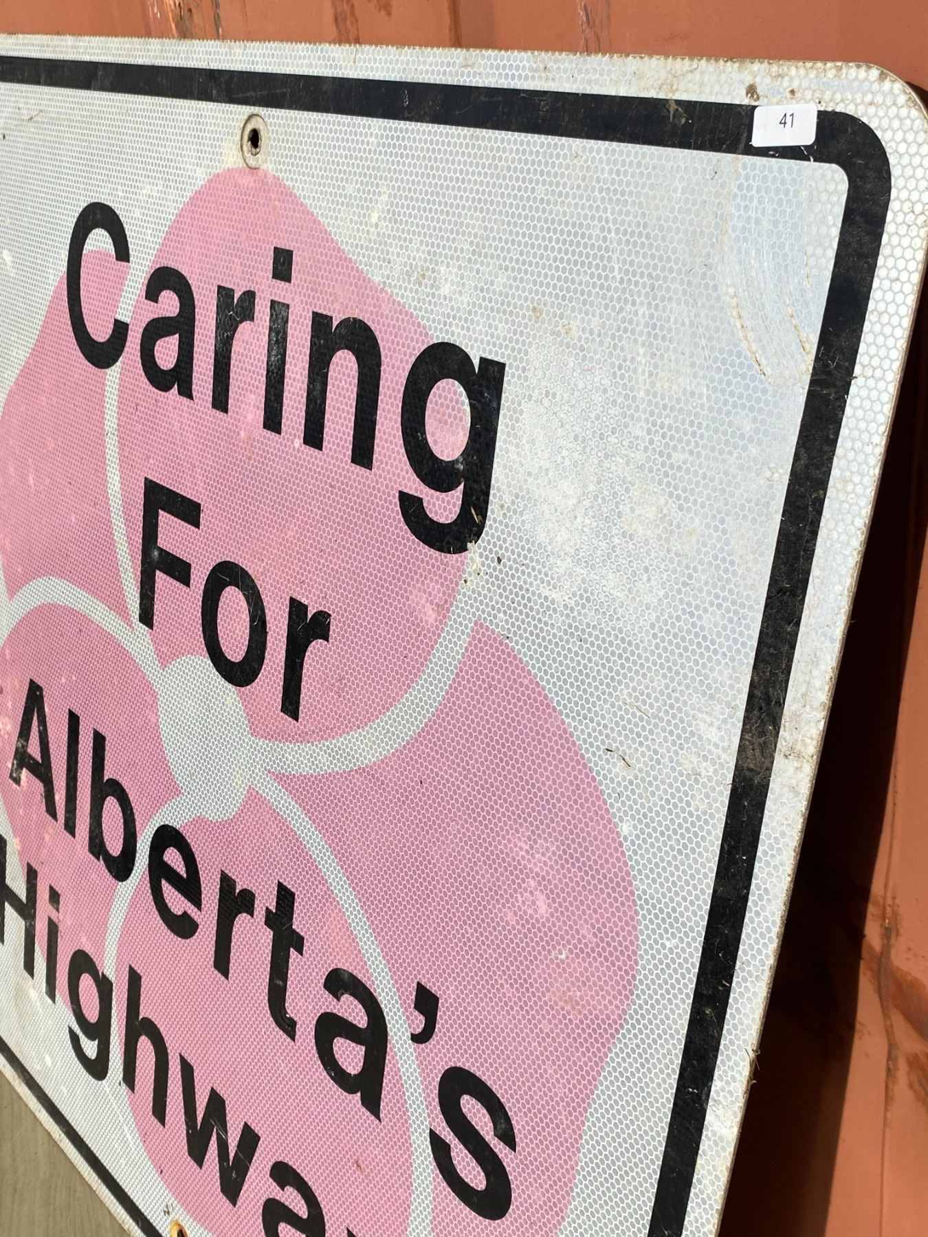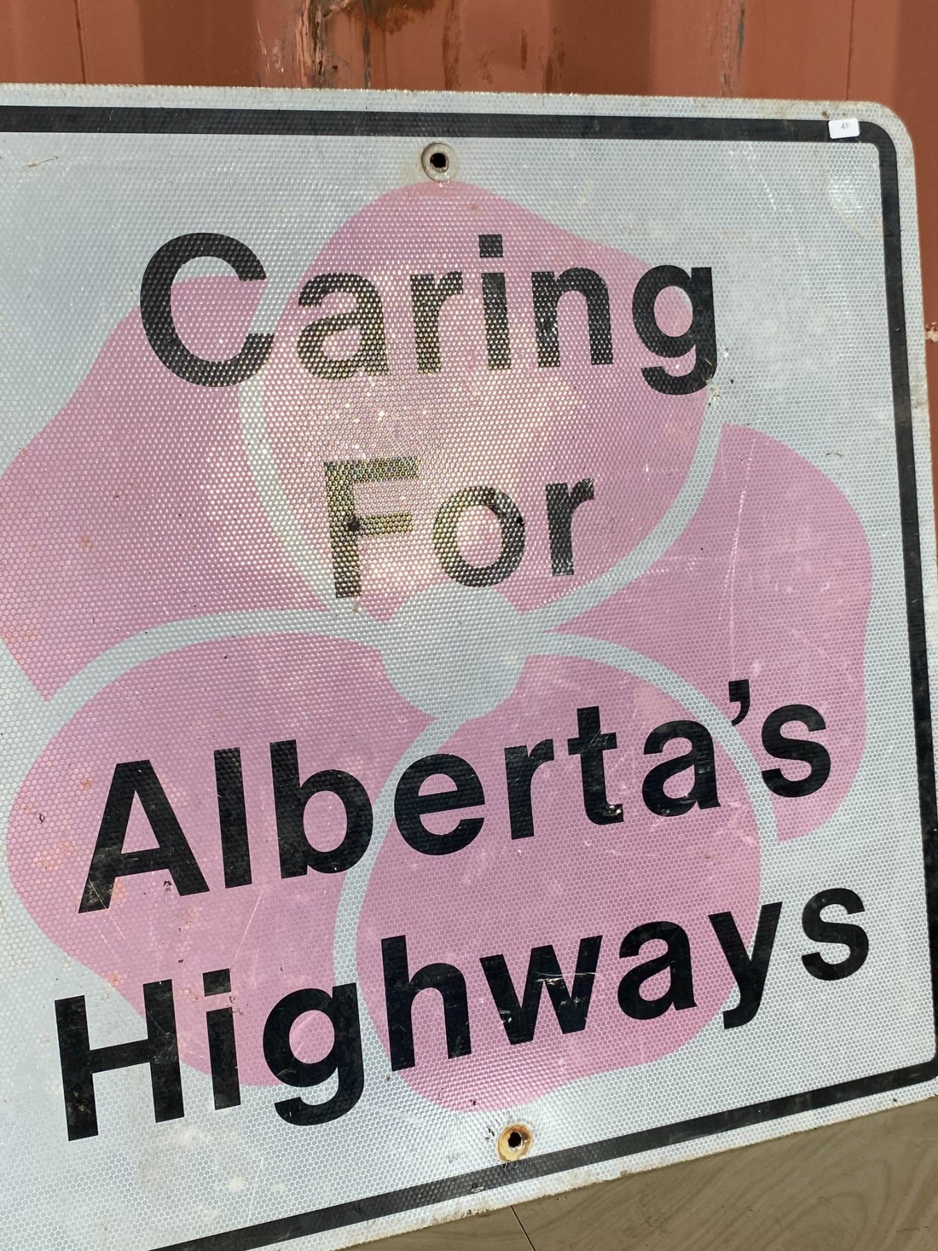 A vintage Alberta Caring for Alberta s Highways sign featuring the iconic pink wild rose. This version shows scratches, dirt, and roadside wear that add to its rustic display appeal.