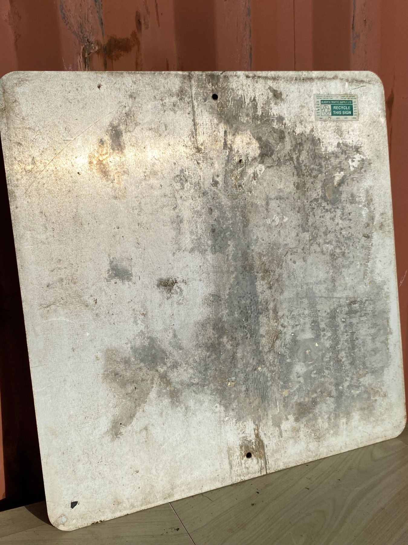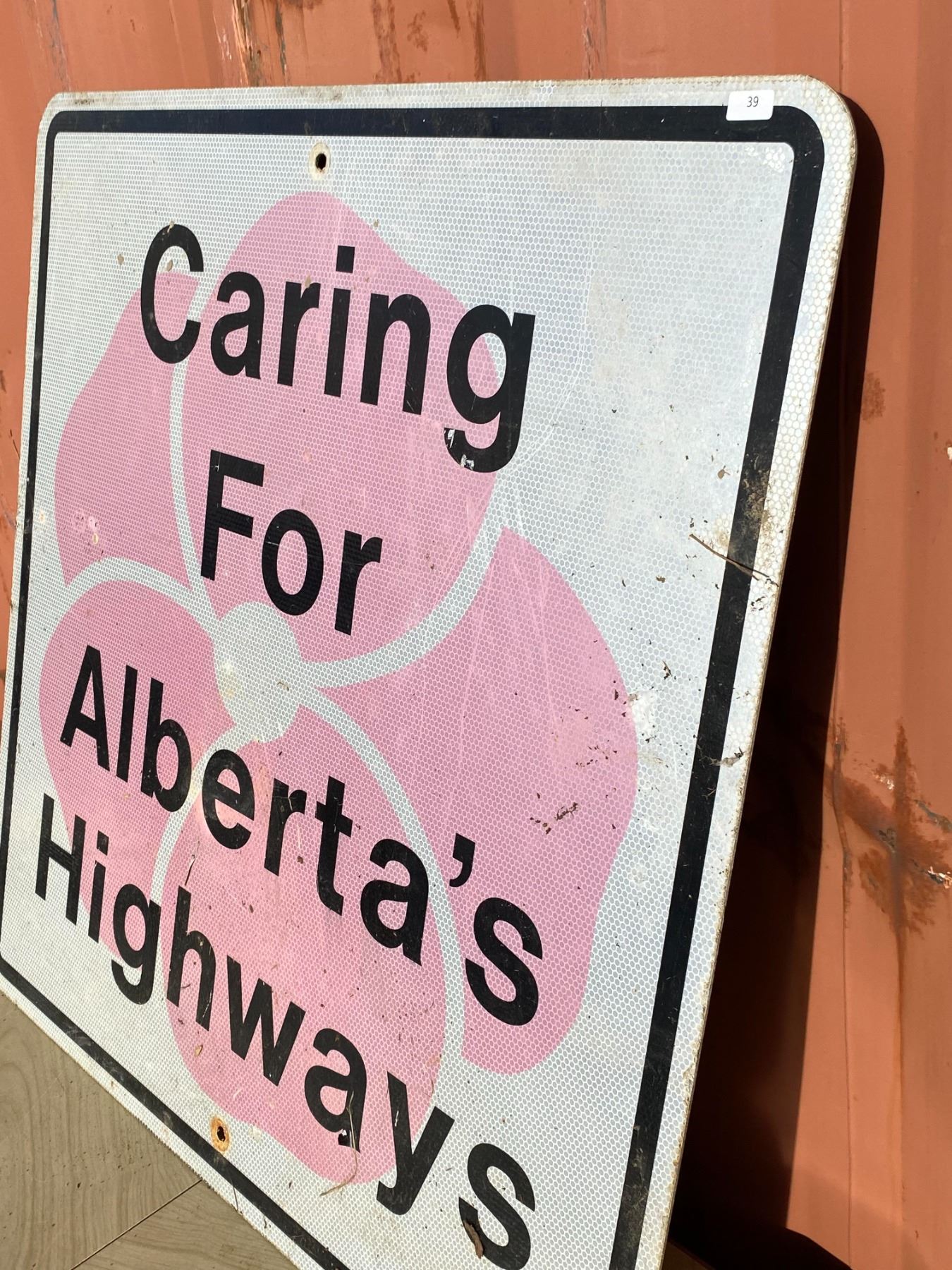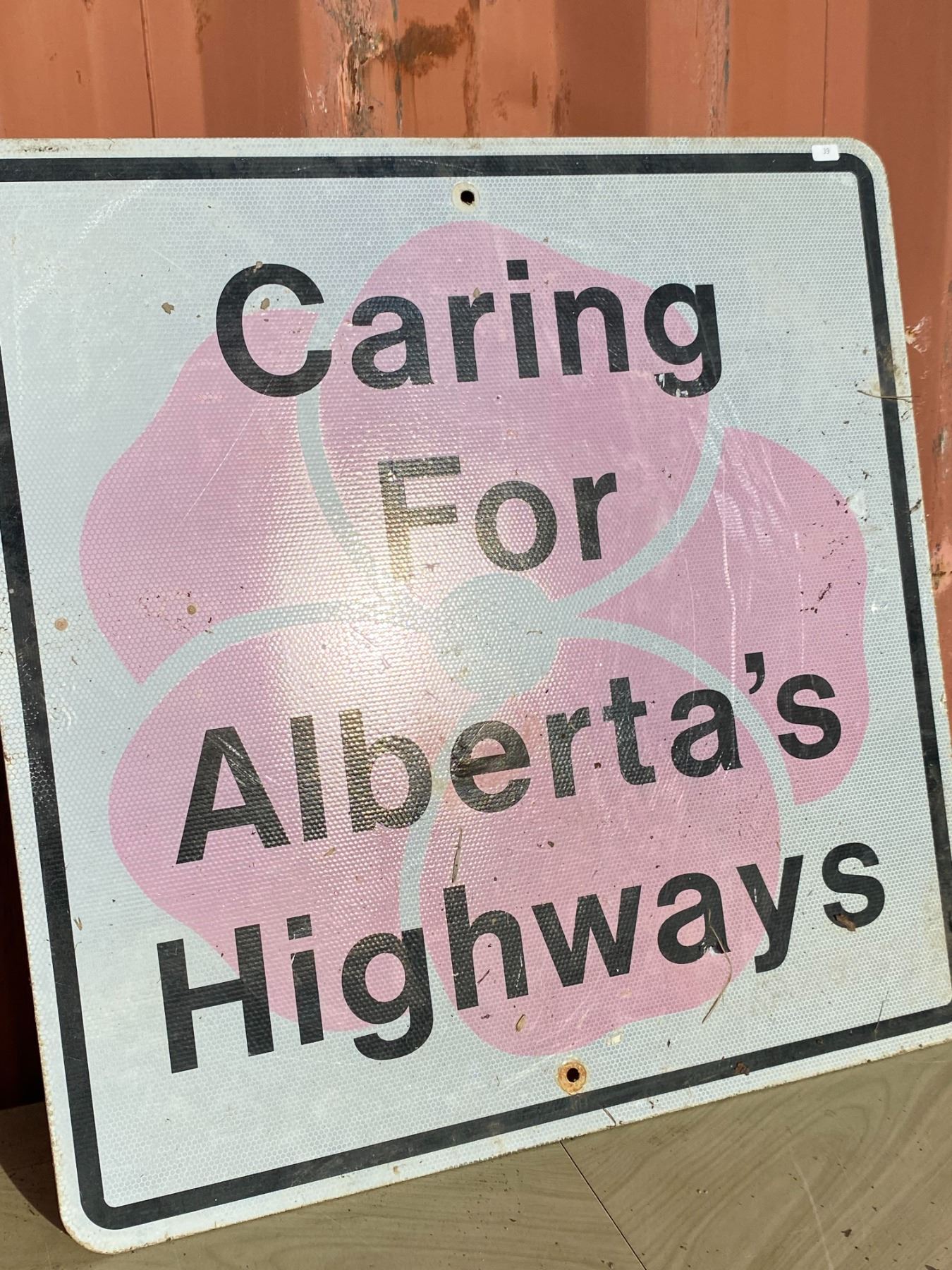 A genuine Alberta highway maintenance sign featuring the classic Caring for Alberta s Highways message with the recognizable pink floral emblem. This reflective metal road sign shows authentic weathering, marks, and patina from outdoor use perfect for collectors of Canadian road signage, garage decor, or rustic display settings.
