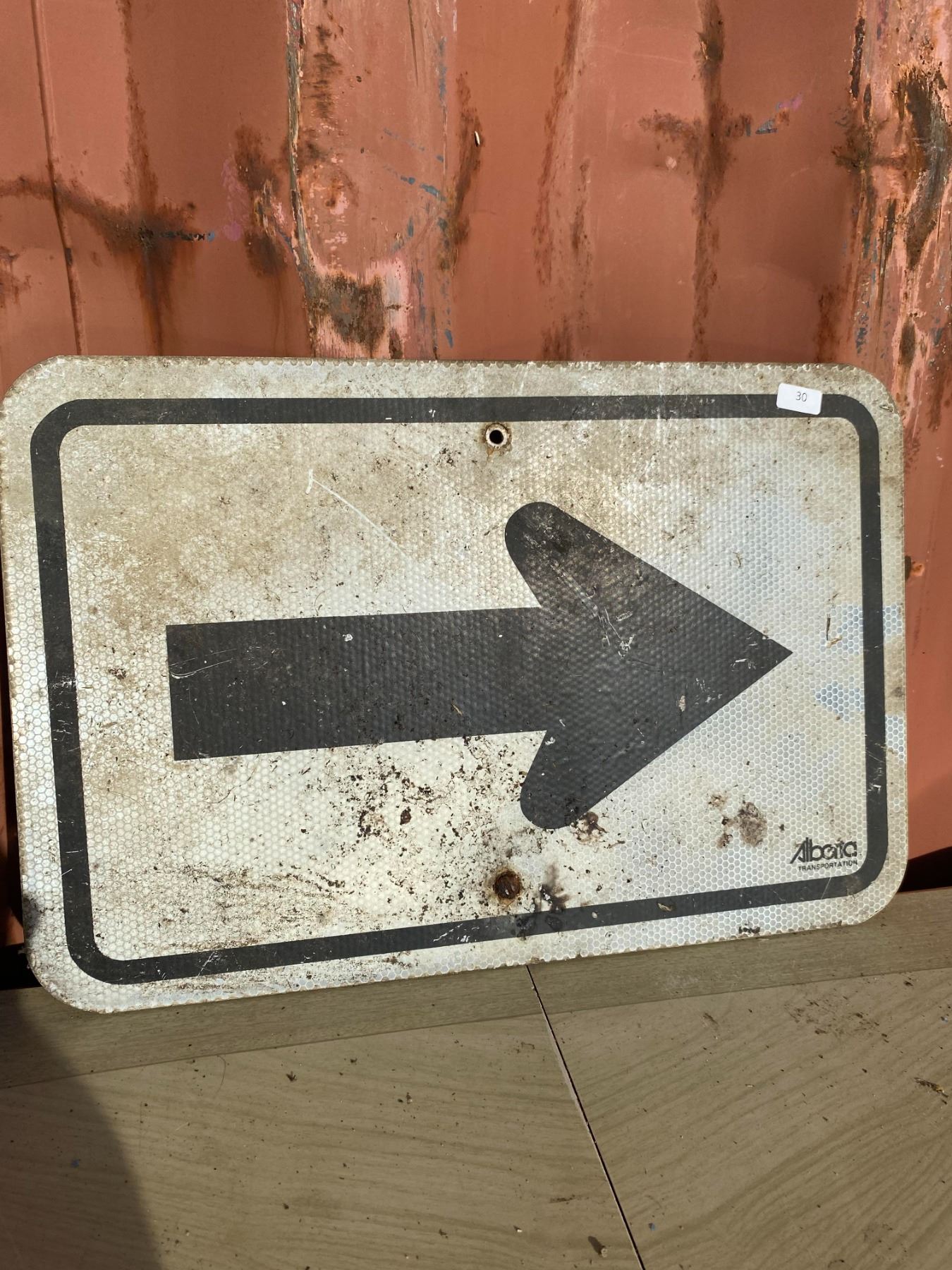 A vintage Alberta Transportation directional arrow sign with bold graphics and reflective surface. This roadside original displays heavy patina, dirt, and age wear from years of exposure, giving it the true industrial character collectors love.