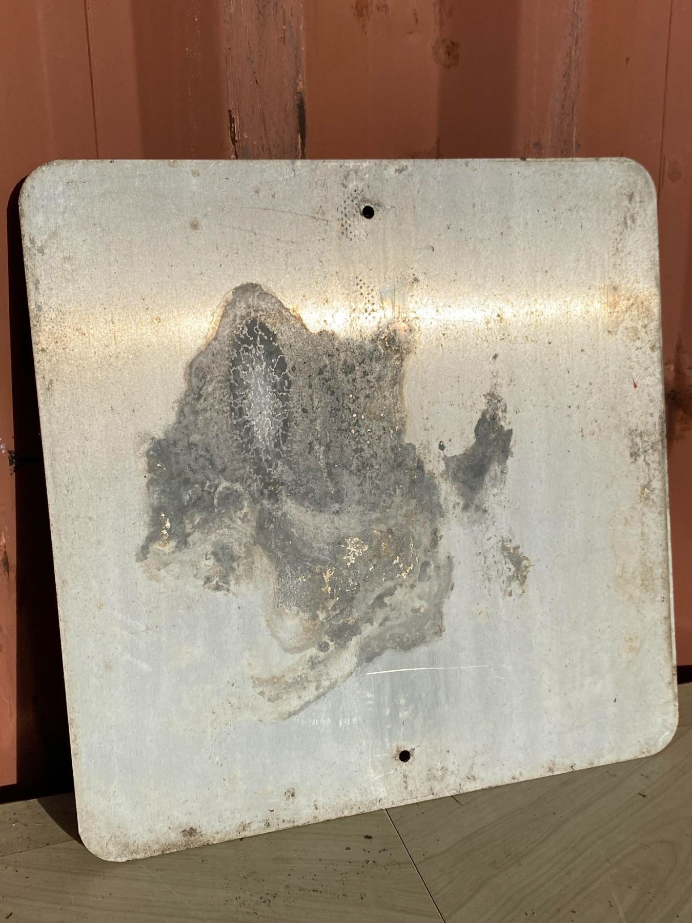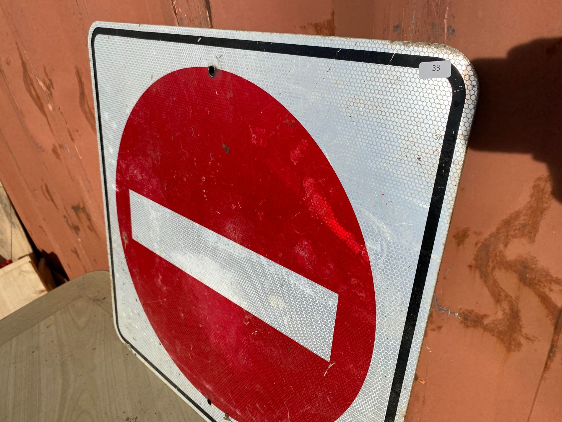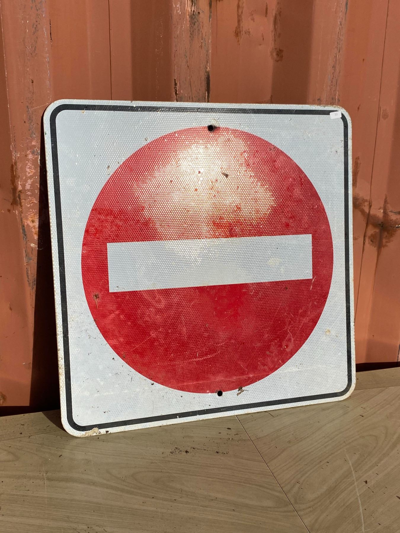 Another genuine Alberta Do Not Enter sign featuring the iconic red and white symbol on a reflective metal panel. This version shows unique wear patterns and patina, offering one-of-a-kind character.
