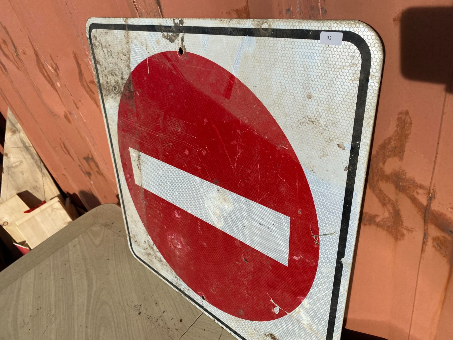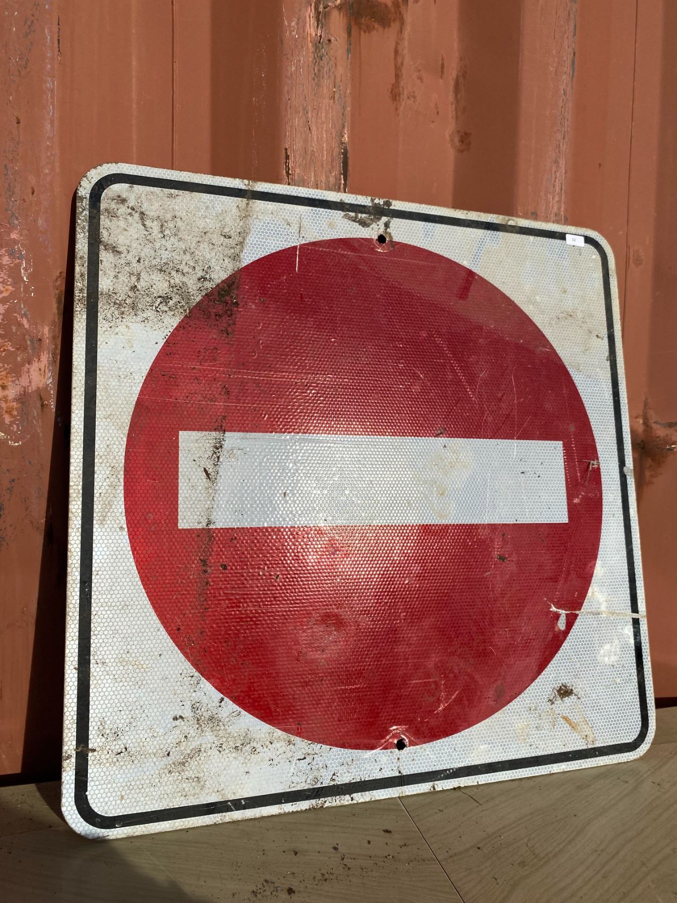 A bold vintage Do Not Enter highway sign from Alberta, complete with reflective surface and the classic red circle with white bar. It shows significant outdoor wear, scratches, and patina, adding authentic roadside charm.