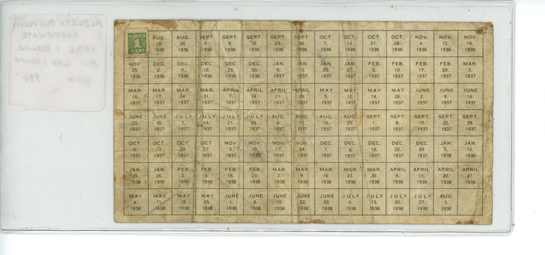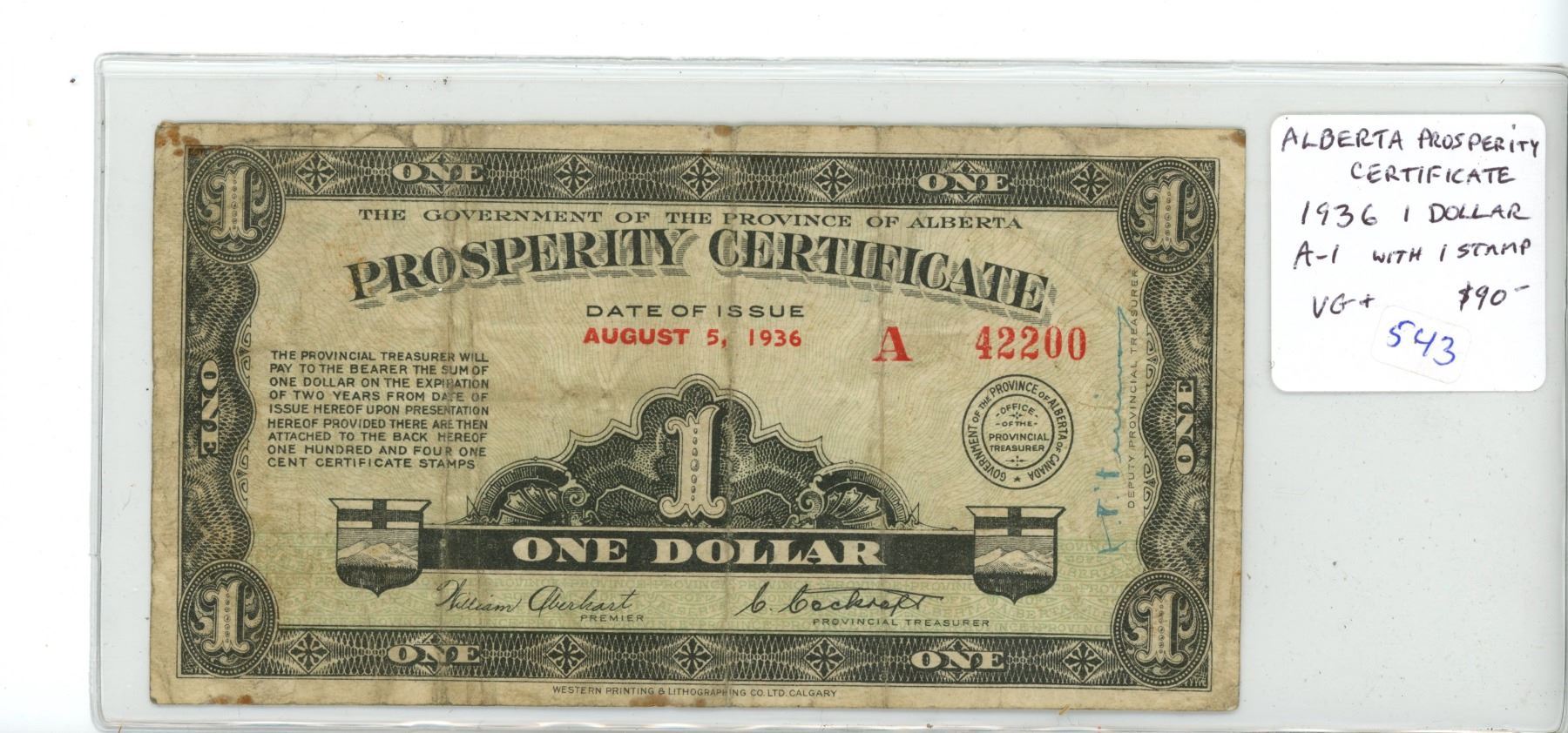 Alberta Prosperity Certificate 1936 One Dollar note with one stamp on back. Issued by the Alberta Social Credit Government. It was a failed experiment at circulating money. A-1. VG+.