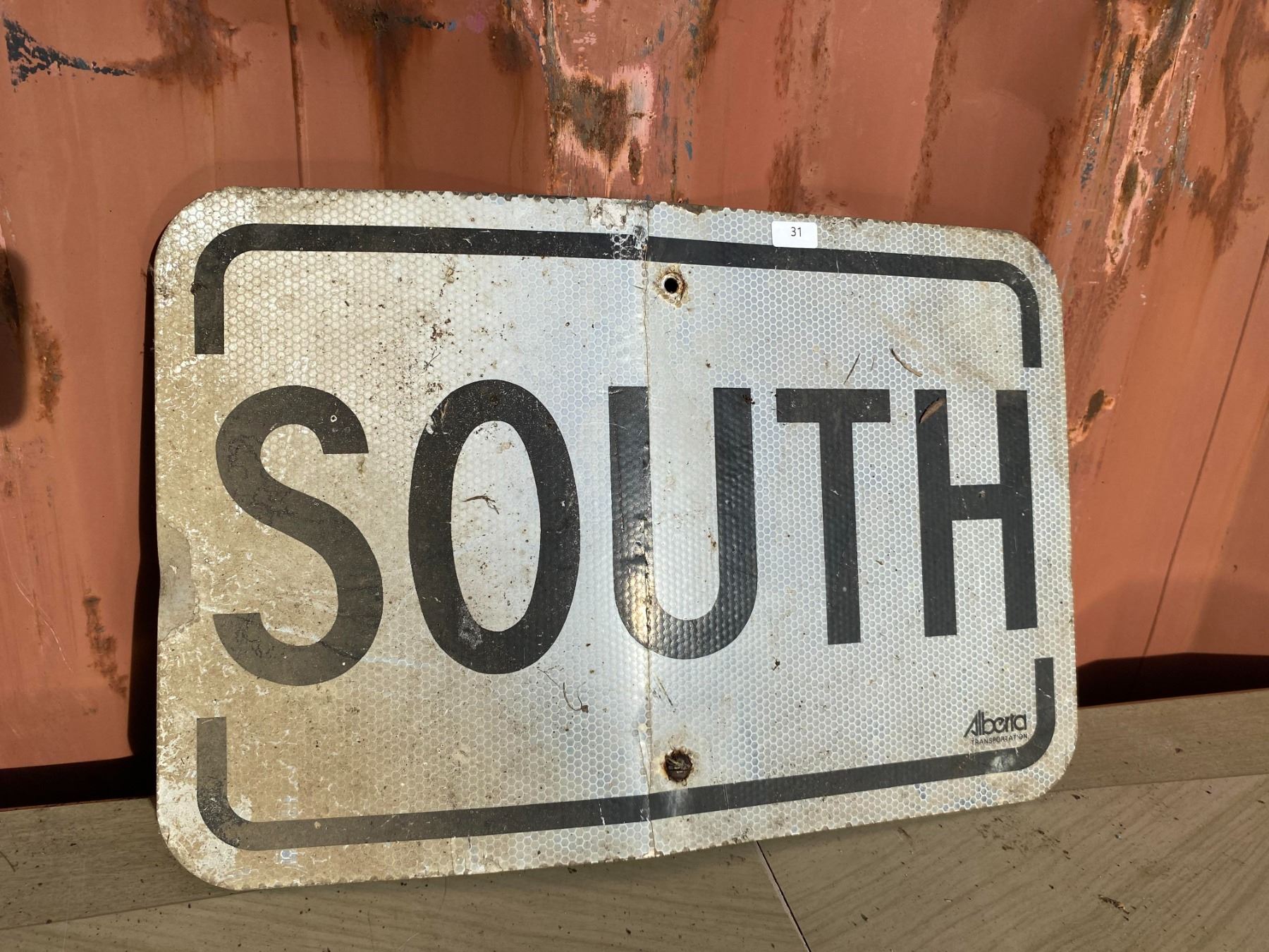 An authentic Alberta Transportation SOUTH road sign with reflective lettering and classic border style. This sign carries notable wear, scratches, and outdoor patina, making it a fantastic addition for collectors of provincial signage or anyone decorating with industrial or retro highway themes.