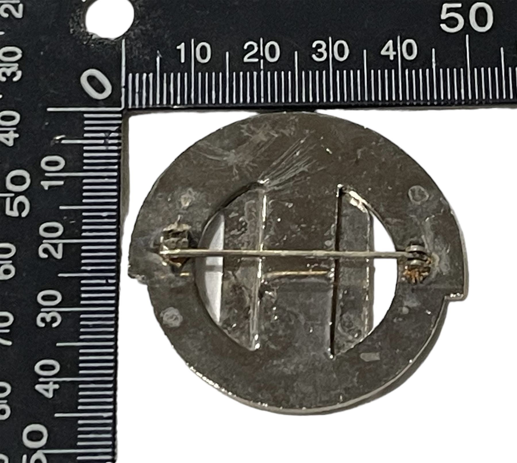 Grey chromed metal with vibrant enamels, Alberta crest is raised. Pin back fastener.