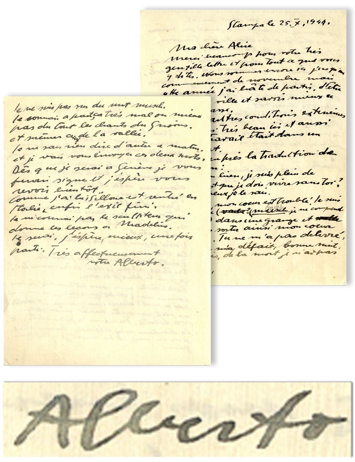 Alberto Giacometti autograph letter signed, composed on 25 October 1944 from Stampa, Switzerland, with content expressing frustration with his work at a time when he was refining his sculptural style to reflect his style of thin, elongated figures. He writes in black fountain pen to his childhood friend Alice Hirschfeld, translated from French in full, ''My dear Alice / Thank you very much for your very kind letter and for everything you say in it. We are still here until the beginning of November, but this year I am impatient to leave, to be in a city and to be better informed of what is going on. / Under different external conditions I would find it very beautiful here, and also if my work were in a different state.