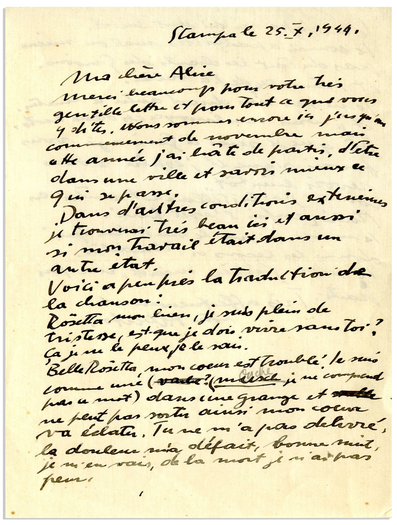 Here is an approximate translation of the song: / Rosetta my dear, I am full of sadness, must I live without you? That I cannot, I know it. / Beautiful Rosetta, my heart is troubled. I am like a ([crossed out]? (fly I don't understand this word) in a barn and cannot get out, so my heart is going to burst. You have not freed me, I am undone by pain, good night, I am leaving, of death I am not afraid.