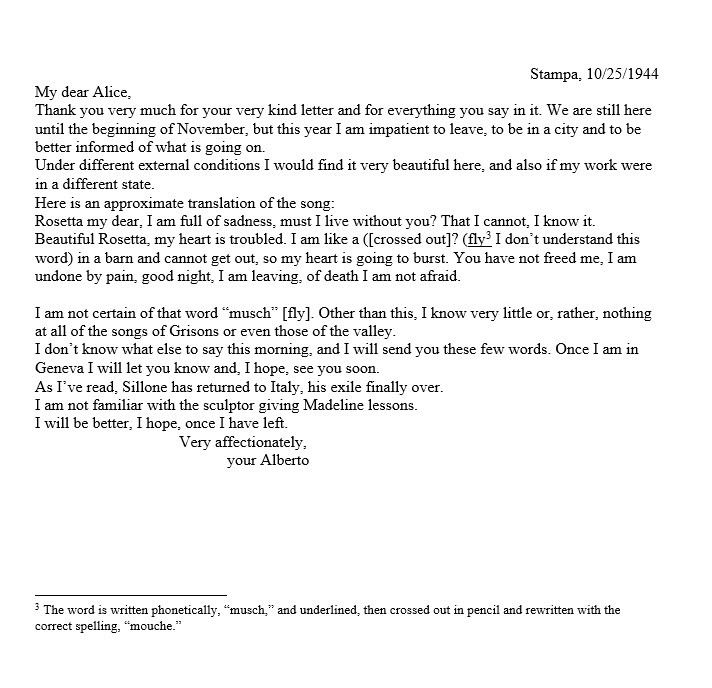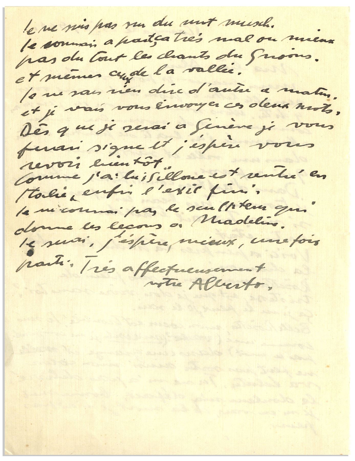 I am not certain of that word 'musch' [fly]. Other than this, I know very little or, rather, nothing at all of the songs of Grisons or even those of the valley. / I don't know what else to say this morning, and I will send you these few words. Once I am in Geneva I will let you know and, I hope, see you soon. / As I've read, Sillone has returned to Italy, his exile finally over. / I am not familiar with the sculptor giving Madeline lessons. / I will be better, I hope, once I have left. / Very affectionately, / your Alberto''. Two page letter on a single sheet measures 5.75'' x 75''. Folds, else near fine condition. A very rare letter by the artist.