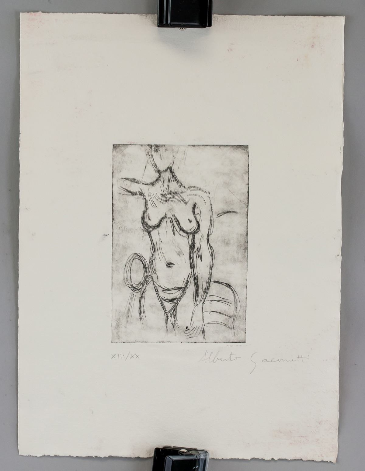 Linocut on paper. Featuring a nude sketch. Signed Alberto Giacometti and inscribed 13/20 in Roman numbers on the lower right and lower left corner, respectively. Attributed to Alberto Giacometti (1901-1966, Swiss). 35 x 25 cm (13.8 x 9.8 inches). PROVENANCE: This lot has limited provenance from a Southern European estate