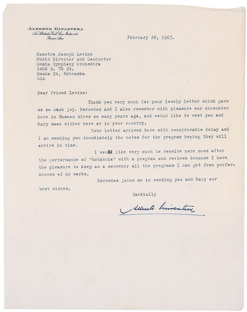 Important Argentine composer (1916–1983) who grouped his music into three periods: ‘Objective Nationalism,’ ‘Subjective Nationalism,’ and ‘Neo-Expressionism.’ TLS, one onionskin page, 9 x 11.25, personal letterhead, February 28, 1963. Letter to Joseph Levine, music director and conductor of the Omaha Symphony Orchestra. In part: “I also remember with pleasure our encounter here in Buenos Aires so many years ago…I am sending you immediately the notes for the program hoping they will arrive in time. I would like very much to receive more news after the performance of ‘Estancia’ with a program and reviews because I have the pleasure to keep as a souvenir all the programs I can get from performances of my works.” In fine condition, with intersecting folds (one vertical fold passing through a single letter of the signature) and some creasing to edges. Accompanied by a letter from his wife, Mercedes, mentioning a few of his works.