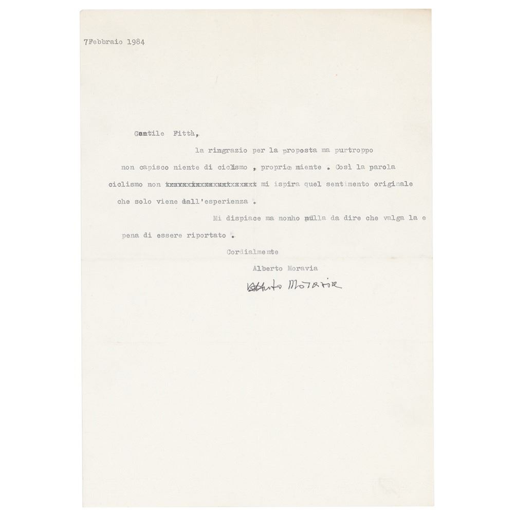 TLS in Italian, one page, 8.25 x 11.75, February 7, 1984. Letter on cycling, in part (translated): "Thank you for the proposal but unfortunately I understand nothing about cycling, just nothing, so the word ciclismo does not inspire in me that original feeling that only comes from experience. I'm sorry but I have nothing to say that is worth being reported." In fine condition.