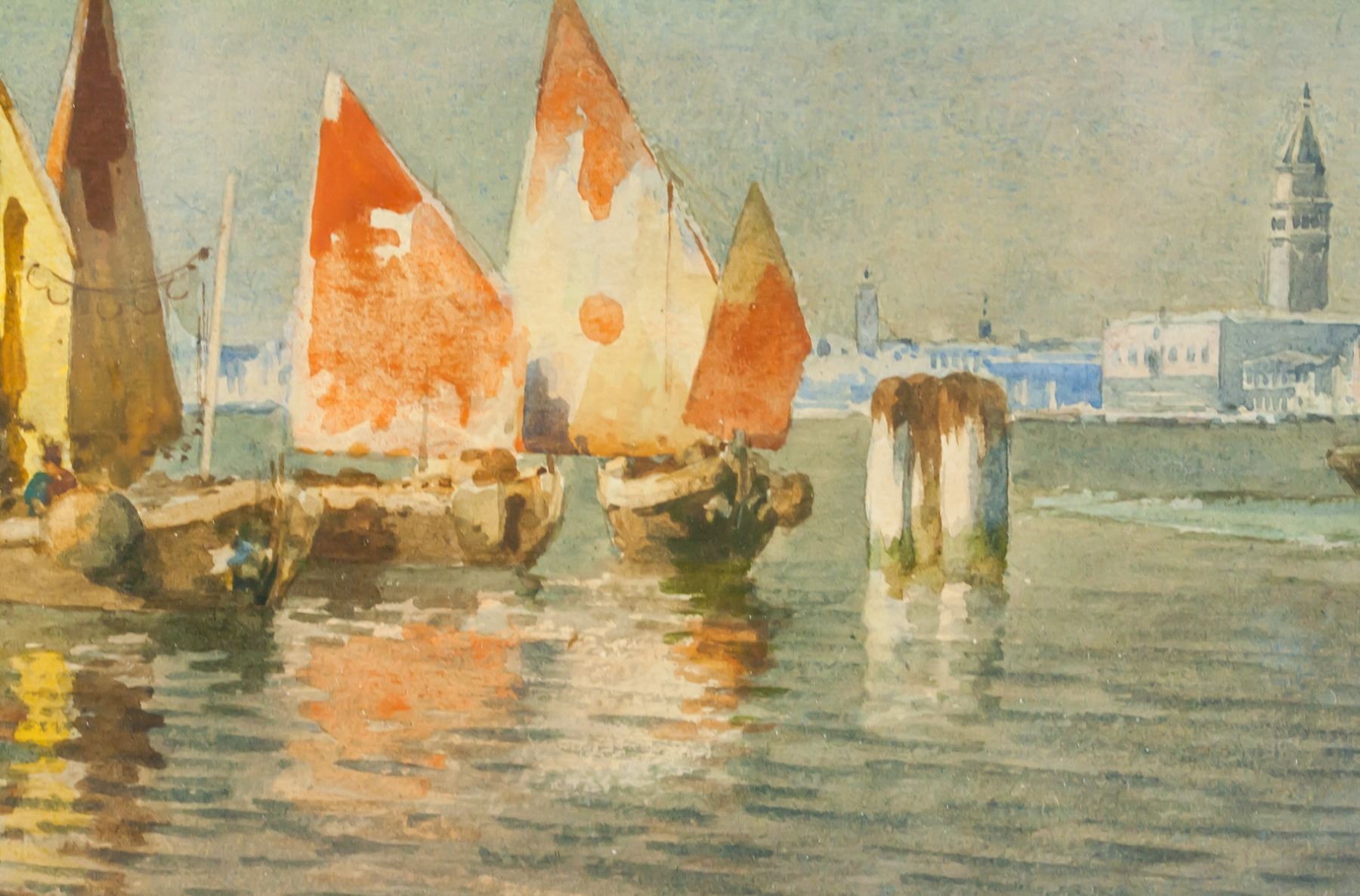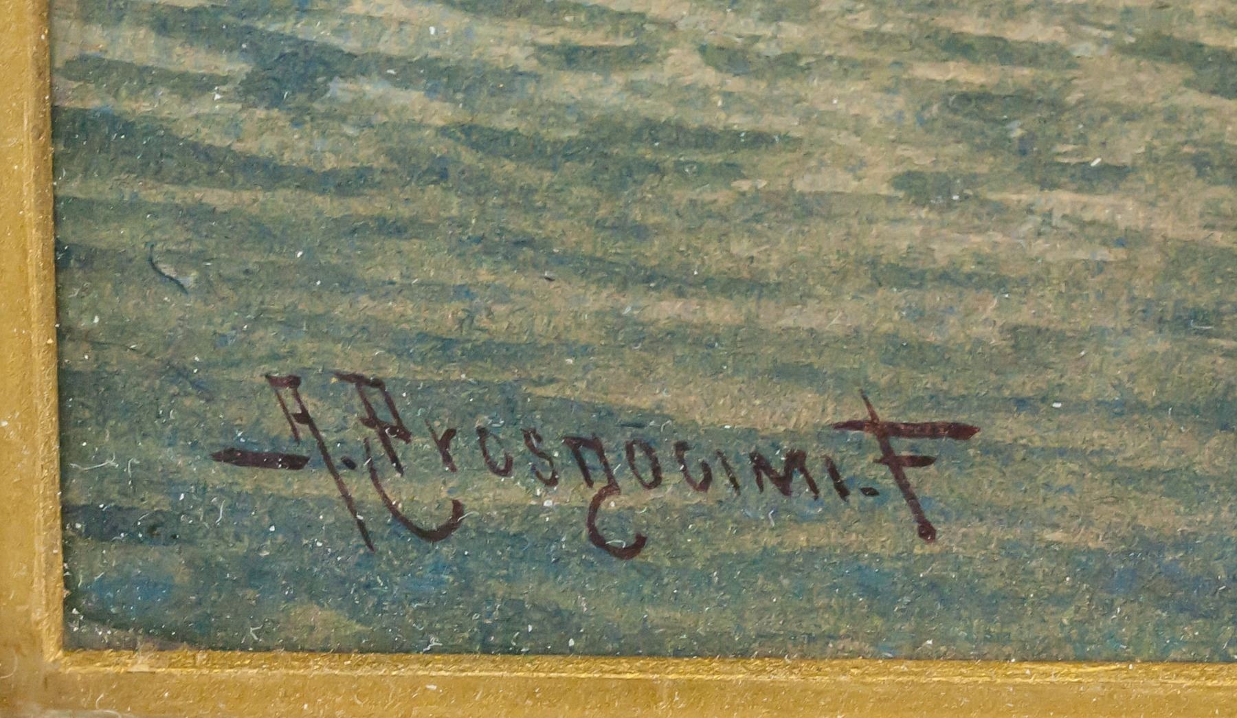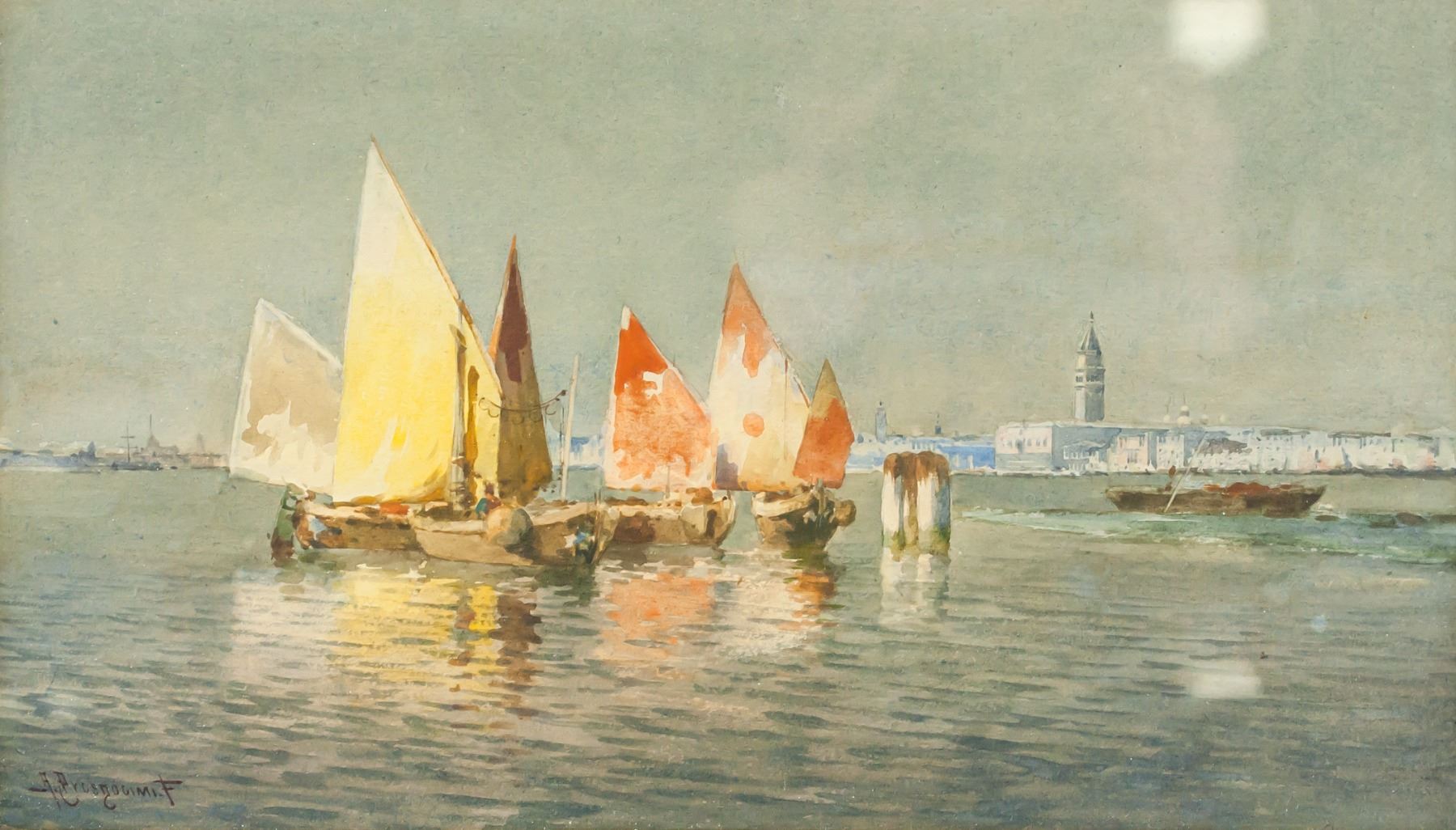 Watercolor on paper, framed. Featuring image of fishing/sailing boats moored in front of Venice.The scene is looking West by Northwest, with St. Mark's Campanile, the bell tower of St Mark's Basilica, in the background, and Basilica di Santa Maria della Salute hidden by the boats. Signed "A Prosdocimi. F" in the bottom left corner. Label affixed to verso reads "THE F.H. BRESLER CO. FINE ARTS 423 MILWAUKEE ST. MILWAUKEE, WIS." Attributed to Alberto Prosdocimi (1852-1925, Italian). 18 x 31 cm (7 x 12 inches), framed: 38 x 51 cm (15 x 20 inches). PROVENANCE: Toronto estate