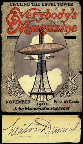 Alberto Santos-Dumont. Brazilian air pioneer whose achievements in France included balloon, airship, and monoplane. Magazine cover, Nov. 1901, illustrating his airship that won first prize for the first flight from St. Cloud, around the Eiffel Tower, and return. Imposing signature "Santos-Dumont." 2 -3/8 x 6 -3/4 . Very fine.