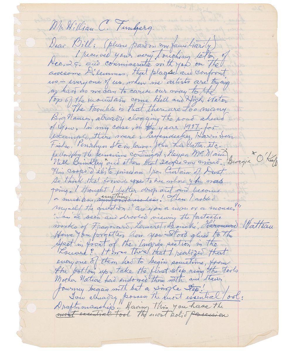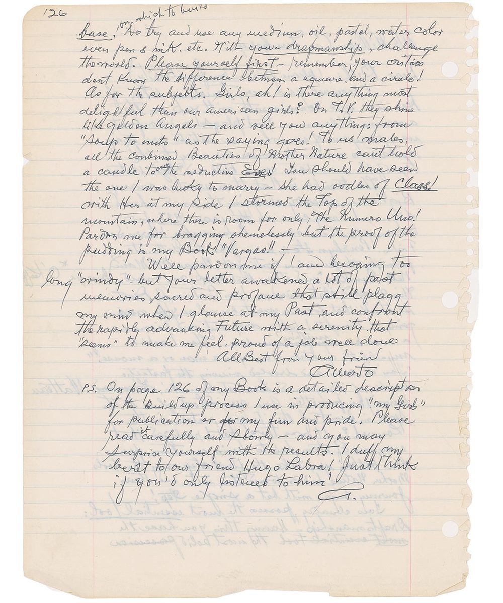 Peruvian-born American illustrator (1896–1982) best remembered for his colorful, sensuous renderings of pinup-style nudes. ALS signed “Alberto,” one page, lightly-lined both sides, 8.5 x 11, no date. Letter to Bill. In part: “I received your very touching letter…we artists are trying as hard as we can to carve our way to the top of the mountain come Hell or High Water. The trouble is that there are too many Big Names, already clogging the road ahead of you. In my case…there were Leyendecker, Harrison Fisher…John La Gatta, etc…The corps d'elite raised an Iron Curtain of Dust…I thought I better drop art and become a musician, anything! Then I asked myself the question: 'are you a man or a mouse? You've seen and drooled viewing the fantastic works of Fragonard…Bouche, Watteau. Have you forgotten how you stood glued to the spot in front of Ingres' section in the Louvre? It was there that I realized that everyone of them had to begin sometime, from the bottom up, take the first step, using the tools Mother Nature had endowed them with, and their journey began with a single step!…Please yourself first, remember your critics don't know the difference between a square and a circle! As for the Girls, Ah! is there anything most delightful than our American girls!…You should have seen the one I was lucky to marry-she had oodles of Class! With her at my side I stormed the top of the mountain, where there is room for only The Numero Uno!” Vargas also adds a short postscript, signed “A” at the conclusion. Scattered light edge creases and toning and several cross outs and corrections by Vargas, otherwise fine condition. A lengthy letter illustrating Vargas‘s struggle and self-doubt as he made his way up the ranks.