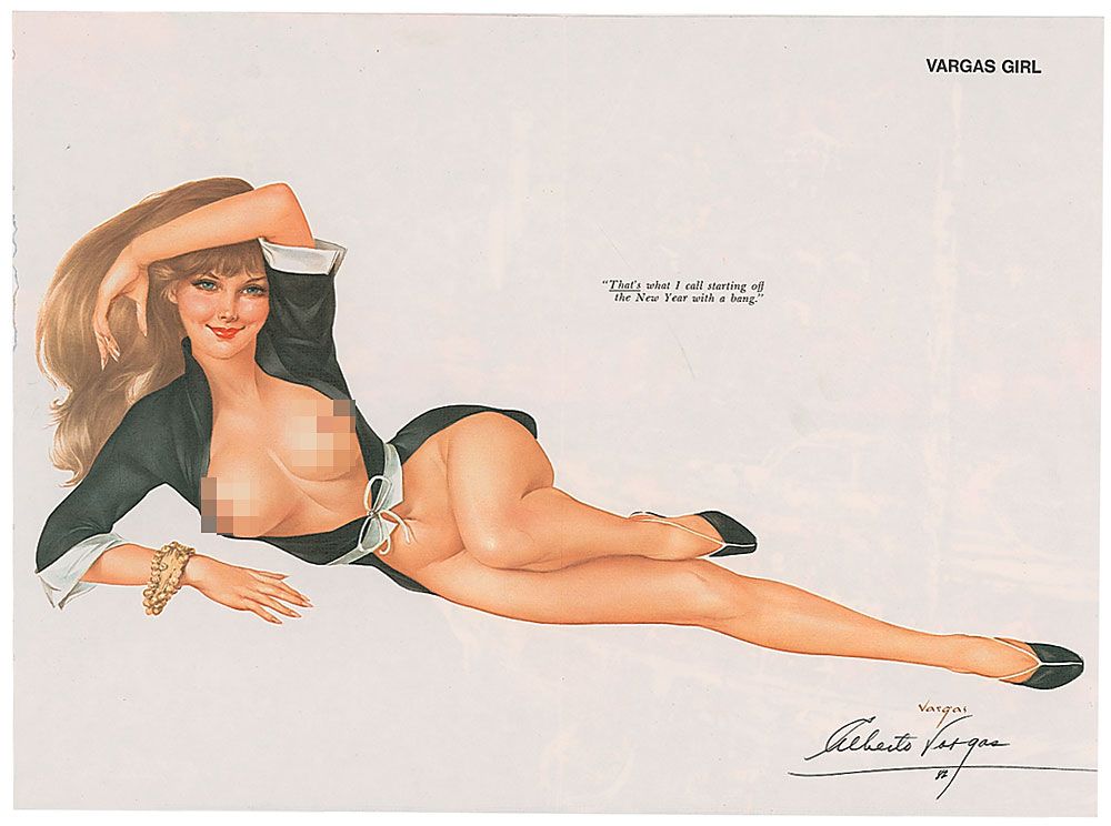 Stunning color print of a topless Vargas Girl on a 15 x 11 book page, with the caption reading, “That’s what I call starting off the New Year with a bang,” signed in the lower right in black ink, “Alberto Vargas 82.” In fine condition, with a central vertical fold.