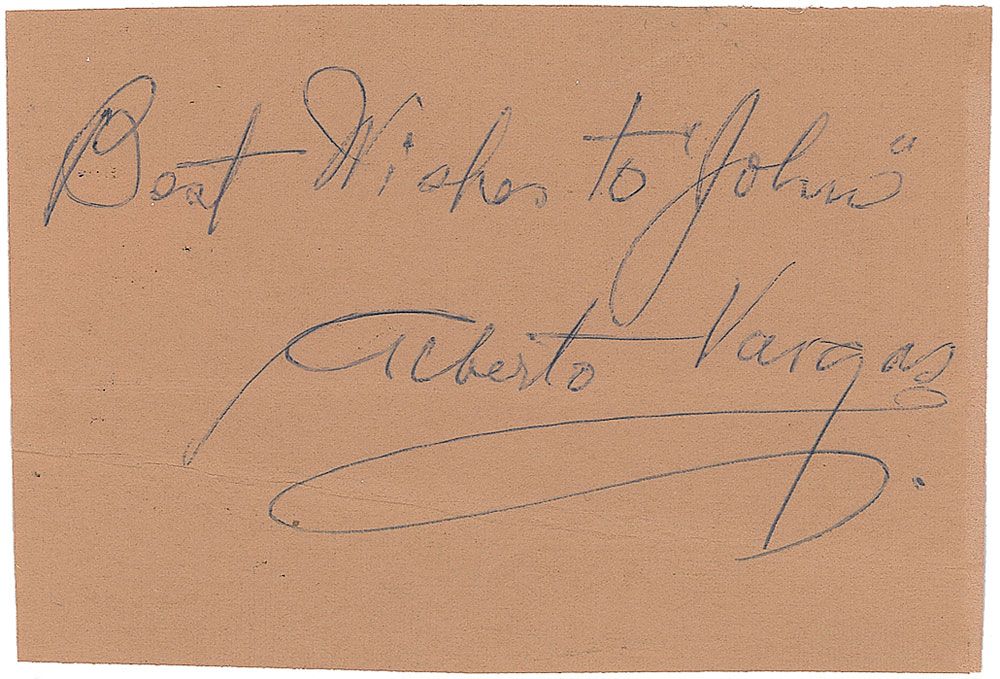 Ballpoint signature and inscription, “Best wishes to ‘John’ Alberto Vargas,” on a light brown 4 x 2.5 slip. In fine condition, with a horizontal crease along bottom of signature, and a diagonal crease through the paraph.