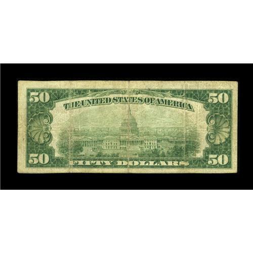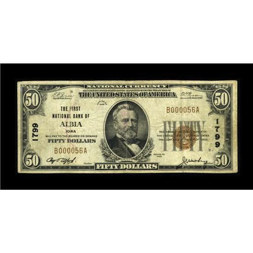 <B>Albia, IA</B></I> - $50 1929 Ty. 1 <B>The First NB</B></I> Ch. # 1799<BR>Less than one year after the introduction of small size notes, this bank was liquidated. It is no wonder then why only 58 sheets of $50's and 2 sheets of $100's were the only small size emissions. This note was on the third to last sheet and is one of only four small size notes known on the bank. <B>Fine.</B></I><BR><BR><b>Shipping:</b> Coin/Currency (<a target="_blank" href="http://www.heritageauctions.com/common/shipping.php">view shipping information</a>)