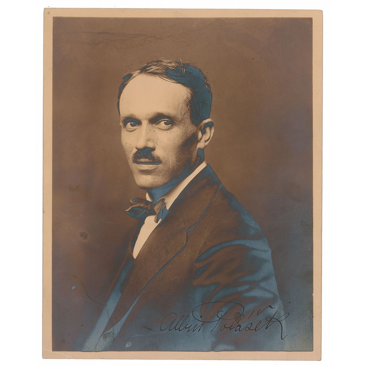 Czech-American sculptor and educator (1879–1965) who created more than four hundred works during his career. Matte-finish 7.5 x 9.5 portrait of Polasek in a suit and bow tie, signed at the bottom in fountain pen. In very good to fine condition, with noticeable silvering to dark areas of the image, a few surface spots and stains (one affecting a couple letters of his last name), and some light contrast to portions of the signature.