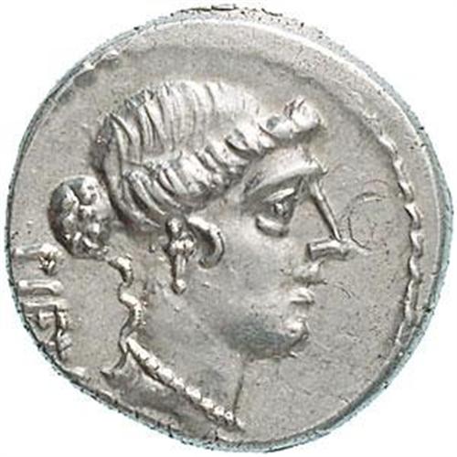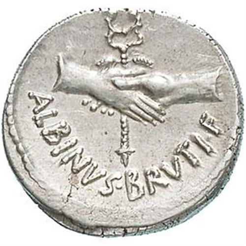Repubblica Romana. Albinus Bruti f. Denarius, 48 a.C. D/ PIETAS. Testa della Pietas a destra. R/ ALBINVS BRVTI F. Due mani che si stringono su caduceo. Cr. 450/2. B. (Postumia) 10. gr. 4.09 AG. Insignificante contromarca al D/, altrimenti FDC.