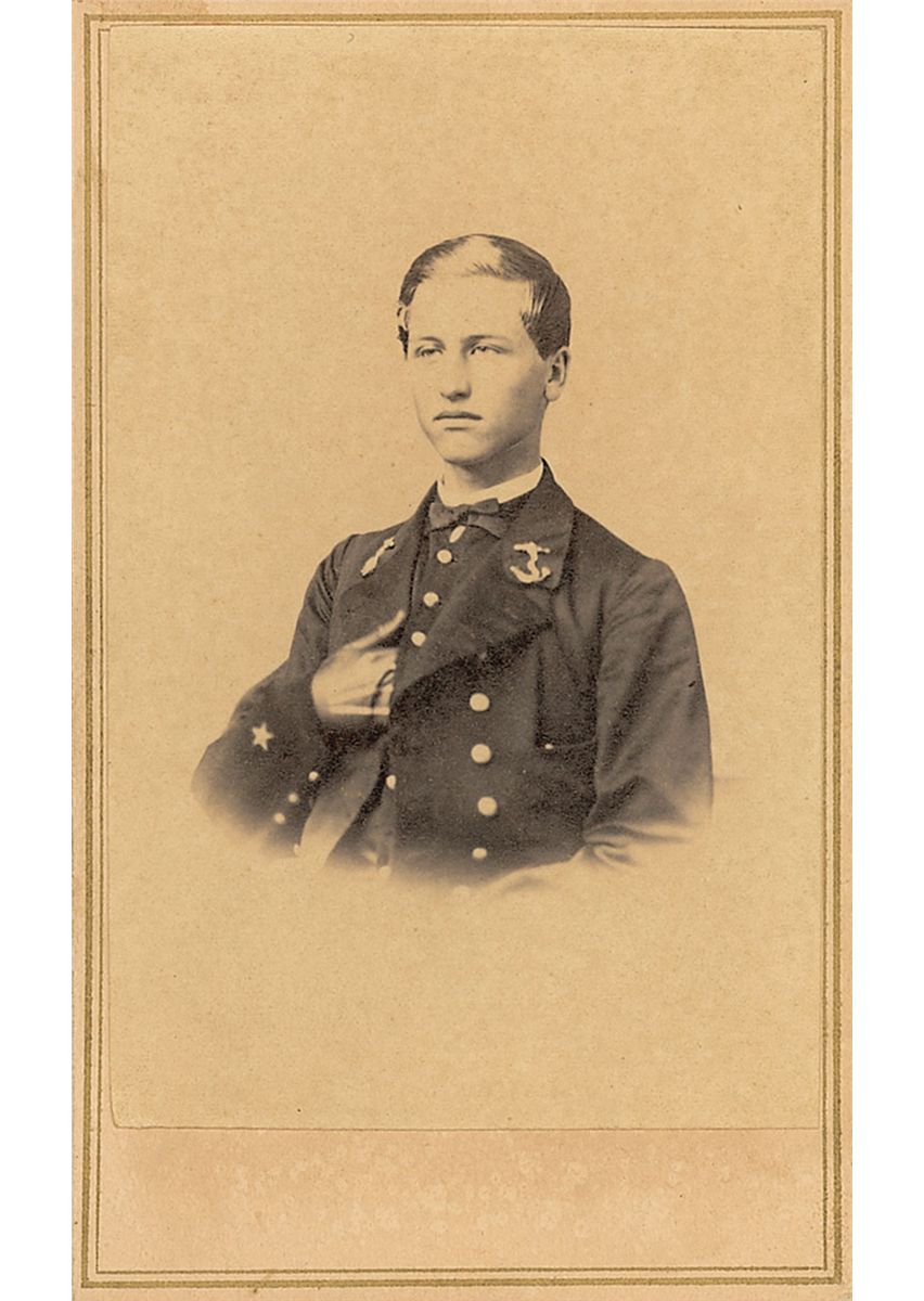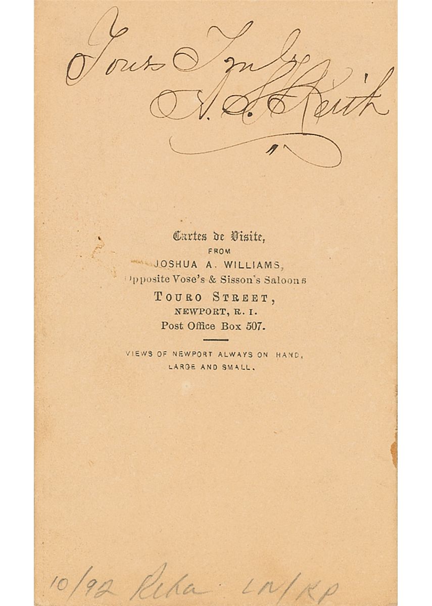 Ensign in the US Navy who was forced to retire in 1887 due to illness. Original 2.25 x 4 carte-de-visite photo by Joshua Williams of Newport, Rhode Island, signed on the reverse in black ink, “Yours truly, A. S. Keith.” In fine condition, with pencil notation along bottom edge of reverse.