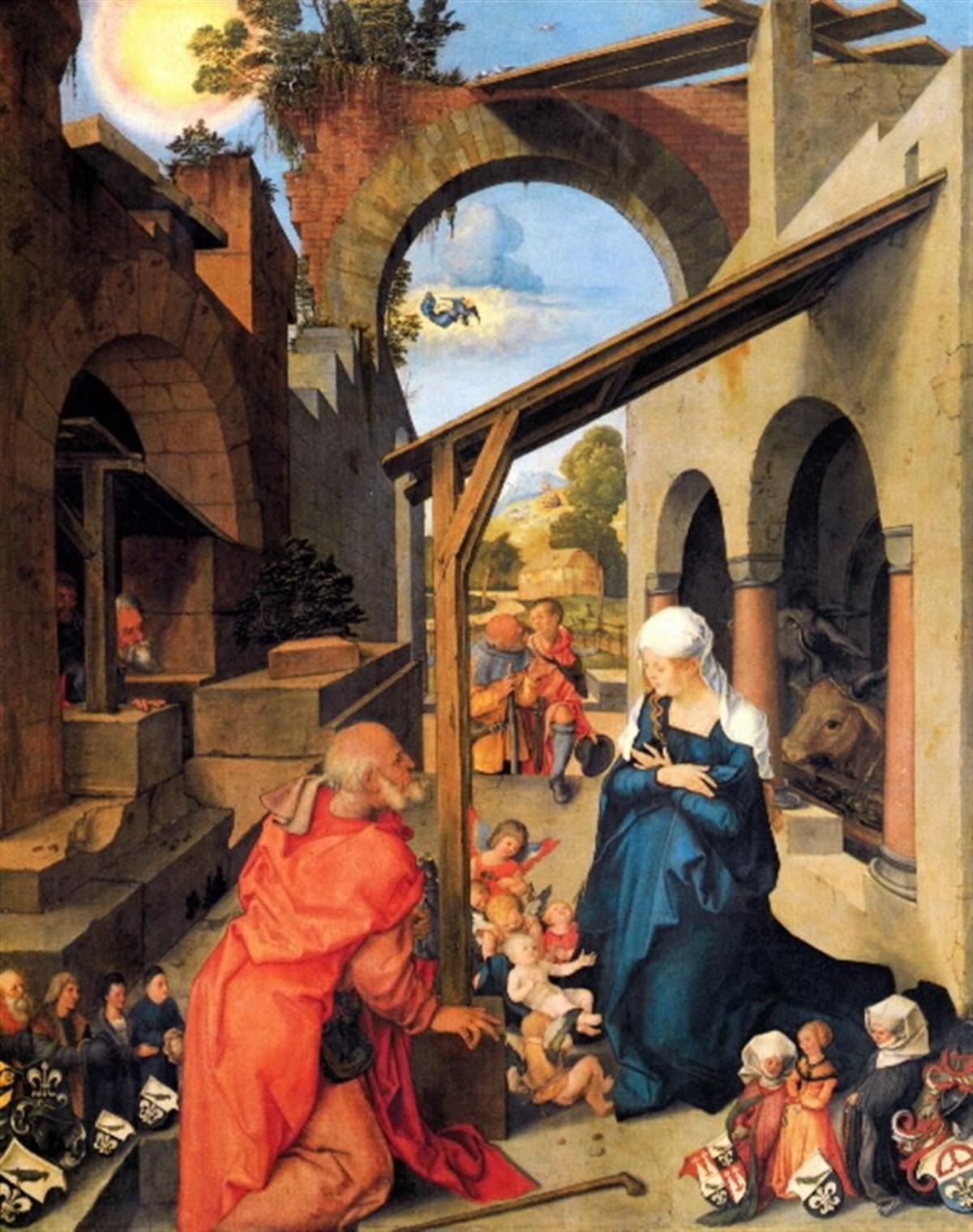 Artist: Albrecht Dürer - Title: Birth of Christ - Medium: Fine Art Giclee on Canvas - Image Size: Approximately 20 inches x 16 inches - Unframed on Unstretched Canvas - Biography: Albrecht Dürer (c. May 1471 - April 1528), sometimes spelled in English as Durer or Duerer (without an umlaut), was a German painter, printmaker, and theorist of the German Renaissance. Born in Nuremberg, Dürer established his reputation and influence across Europe when he was in his twenties due to his high-quality woodcut prints. He was in communication with the major Italian artists of his time, including Raphael, Giovanni Bellini and Leonardo da Vinci, and from 1512 was patronized by Emperor Maximilian I. Dürer is commemorated by both the Lutheran and Episcopal Churches.His watercolours mark him as one of the first European landscape artists, while his woodcuts revolutionized the potential of that medium.