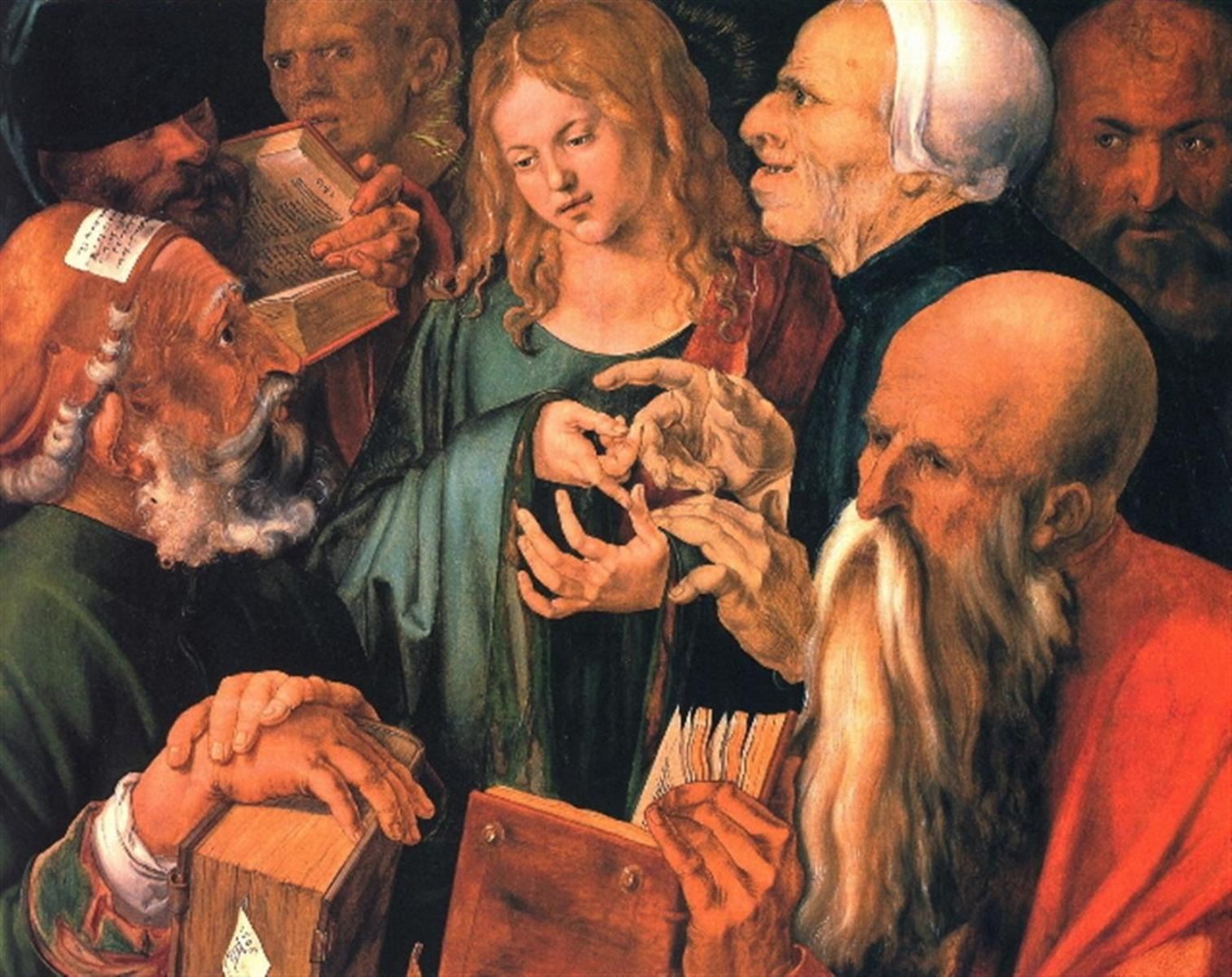 Artist: Albrecht Dürer - Title:Christ Teaches the Learned Men - Medium: Fine Art Giclee on Canvas - Image Size: Approximately 20 inches x 16 inches - Unframed on Unstretched Canvas - Biography: Albrecht Dürer (c. May 1471 - April 1528), sometimes spelled in English as Durer or Duerer (without an umlaut), was a German painter, printmaker, and theorist of the German Renaissance. Born in Nuremberg, Dürer established his reputation and influence across Europe when he was in his twenties due to his high-quality woodcut prints. He was in communication with the major Italian artists of his time, including Raphael, Giovanni Bellini and Leonardo da Vinci, and from 1512 was patronized by Emperor Maximilian I. Dürer is commemorated by both the Lutheran and Episcopal Churches.His watercolours mark him as one of the first European landscape artists, while his woodcuts revolutionized the potential of that medium.