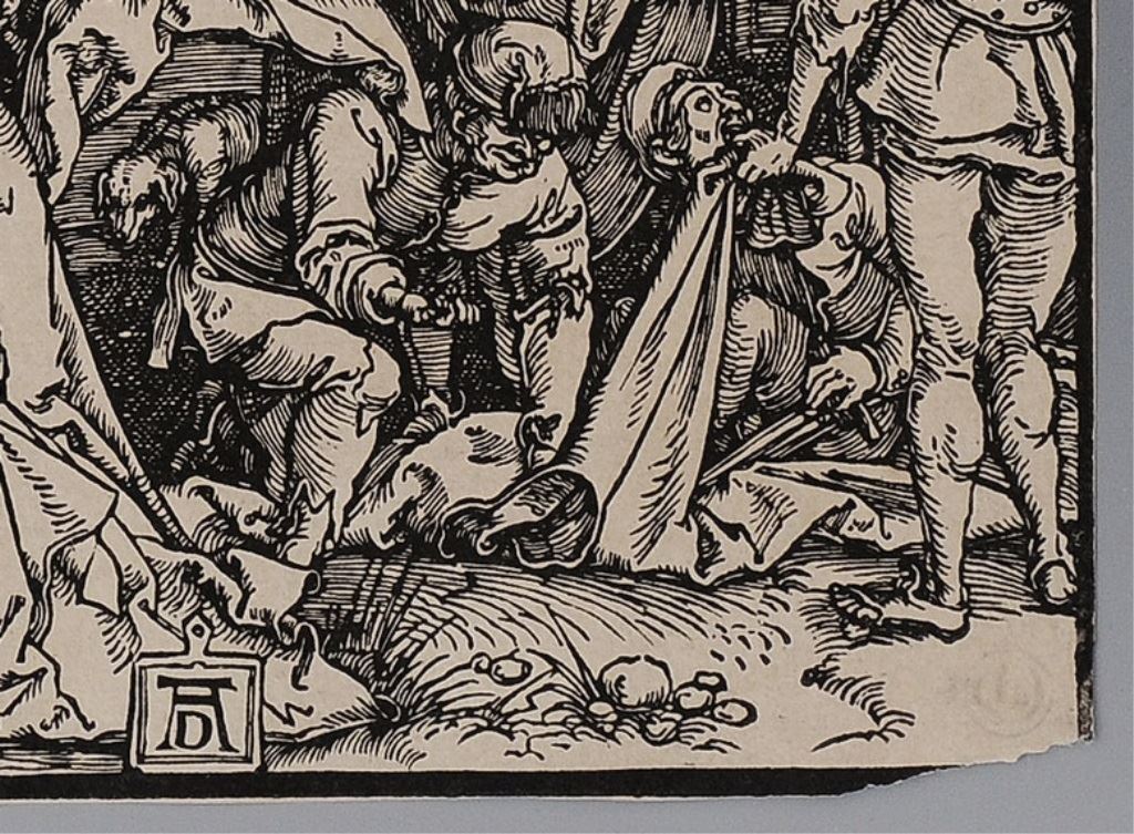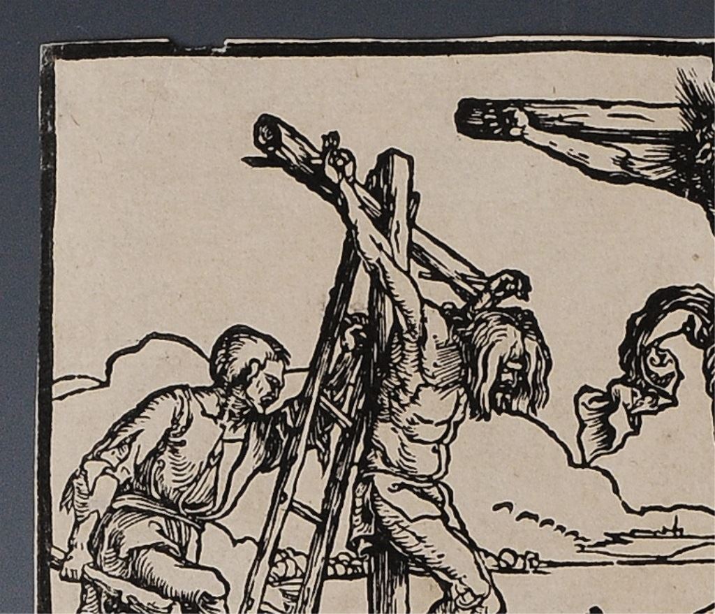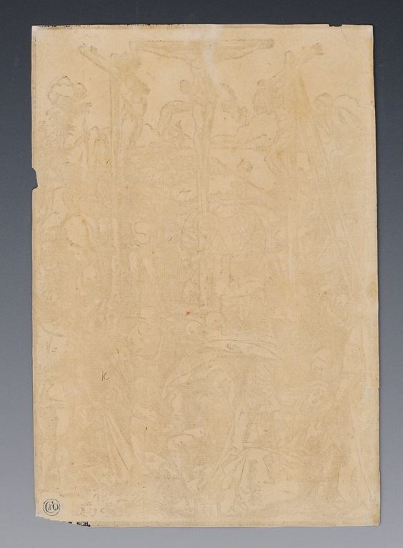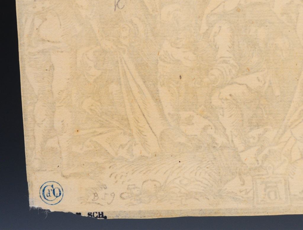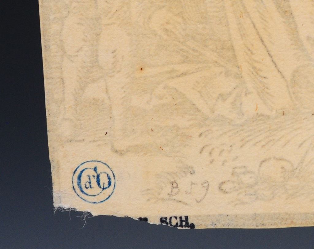 CONDITION REPORT: trimmed just outside of border with edge chips top left and lower right, light wrinkle at upper left, collector's stamp ...
