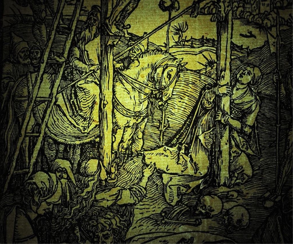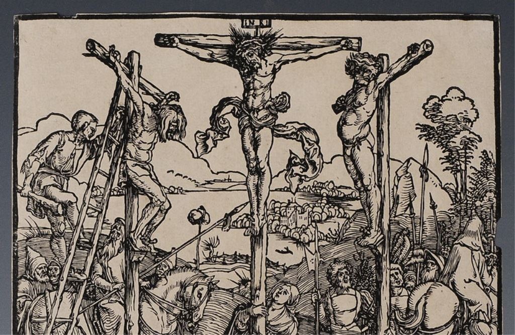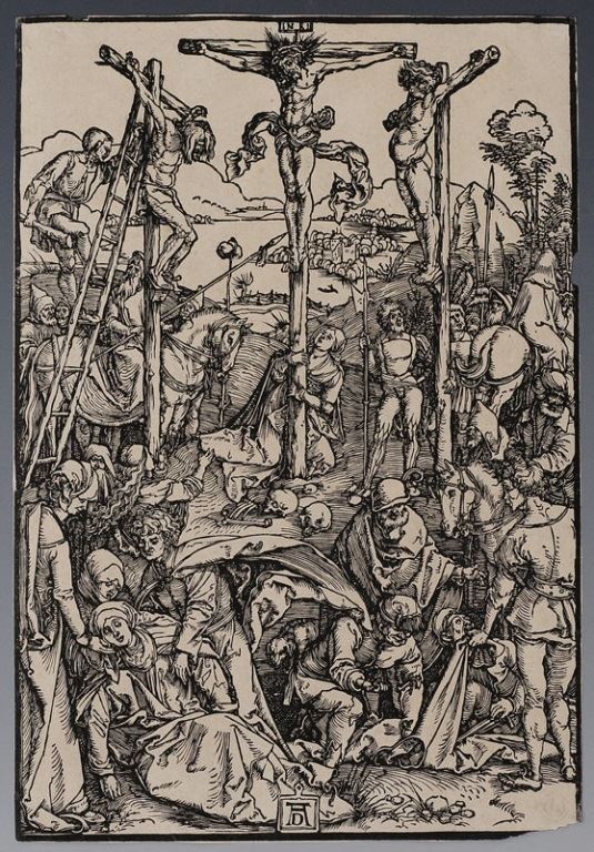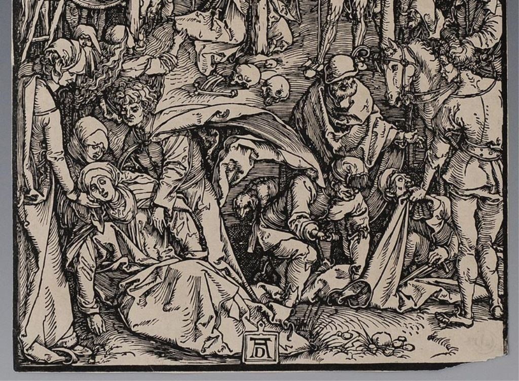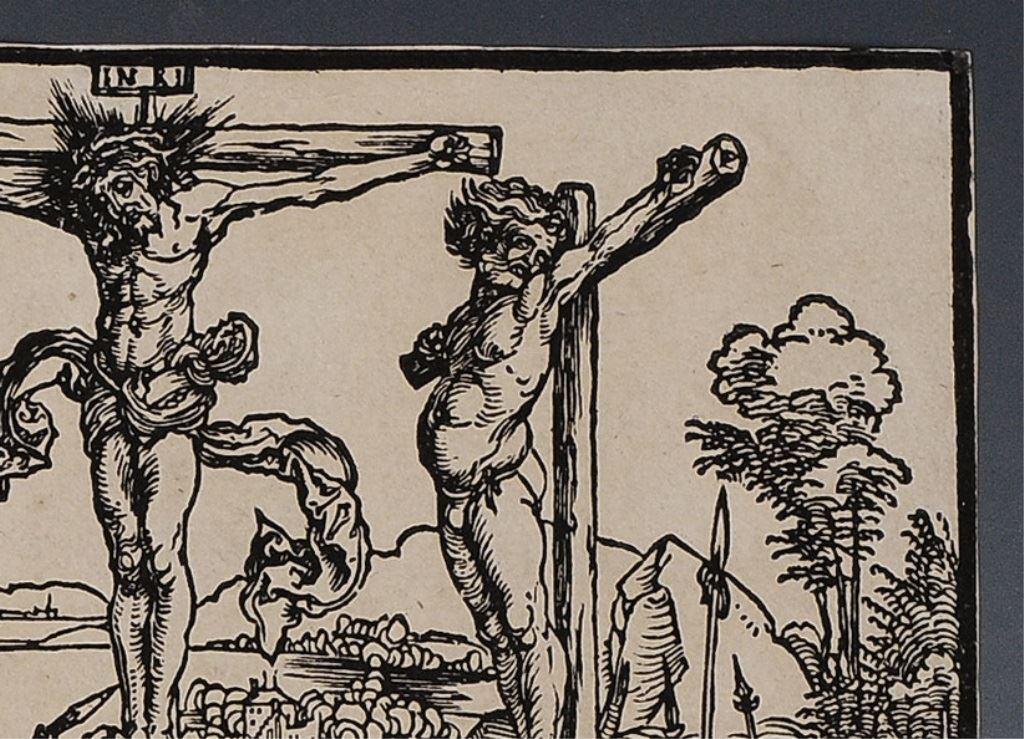 CONDITION REPORT: trimmed just outside of border with edge chips top left and lower right, light wrinkle at upper left, collector's stamp ...