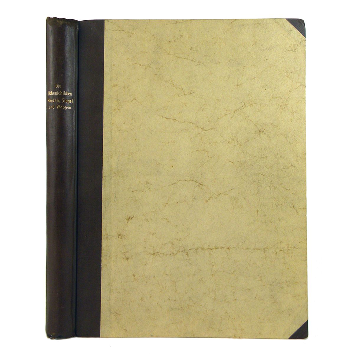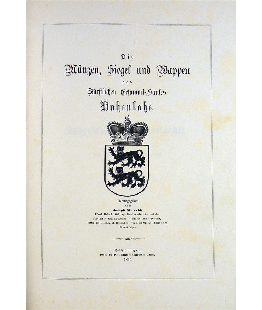 Albrecht, Joseph. DIE MÜNZEN, SIEGEL UND WAPPEN DES FÜRSTLICHEN GESAMMT-HAUSES HOHENLOHE. Oehringen: Druck der Ph. Baumann'schen Officin, 1865. Folio, later brown cloth-backed boards, gilt; original printed wraps bound in. (4), 298 pages; occasional text illustrations; 24 engraved plates. Occasional spotting; near fine. The second and best edition of this important work. Well-printed and visually impressive. Very rare. Clain-Stefanelli 9393.