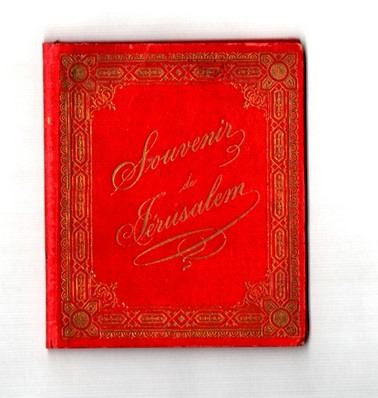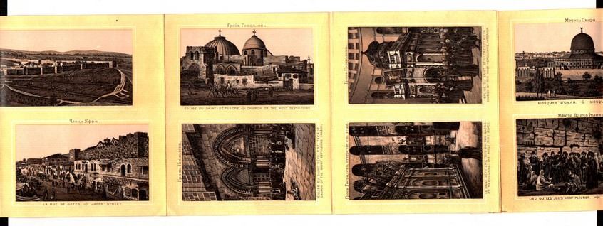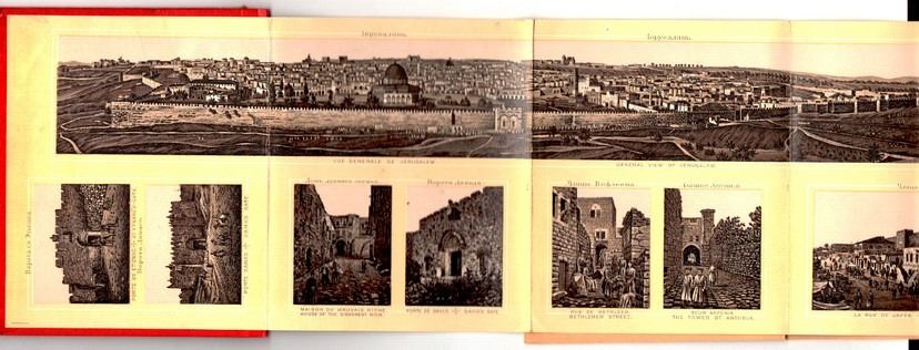 Album and binder - pictures from the Holy Land - souvenir from Jerusalem, Mandatory Palestine, contains large panoramic picture of Jerusalem and additional sites across the city. Also includes a number of places in Eretz Israel. In English, French and Russian. Good condition: somewhat timeworn. Dimensions: 12.5x15 cm.