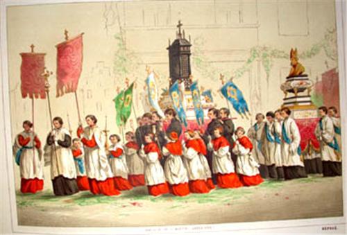 Album de la Procession générale, qui eut lieu à Gand le 20 mai 1855, en l'honneur de l'Immaculée Conception de la Très-Sainte Vierge Marie. Gand, G. Jacqmain, 1857. In-f° oblong : [4]-xvi-8 pp. et 25 pl. Rel. de l'époque : demi-chagrin rouge, plats de perc. rouge titrée "Procession générale du 20 mai 1855" (cuir épidermé en queue, mors, coins et coupes frottés, lég. insolation sur les plats).