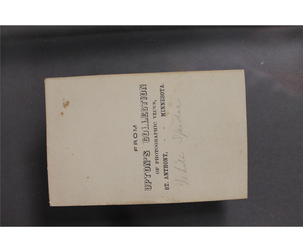 [Photographs/Native Americans]. 16 carte-de-viste photographs, mostly featuring Native Americans. In contemporary album. Some original, some from portraits. Several by Whitney?s Gallery, St. Paul, Minnesota. A few by Upton?s in St. Paul. At least 1 photo has 2-cent stamp on verso. Most have printed caption below photo; several photos untitled save for a handwritten caption. A minority have an extended title clipped from lower margin. [?1888? pencil gift inscription from previous owner on verso of ffep.] Includes: ++ Group photograph of 10 men, posing in front of what may be a dwelling, several holding wooden poles (untitled). ++ Chan-Ku Was-Te Win. ++ Paha-Uza-Tanka, The Great Scalp Taker. ++ Sha-Kpe (Little Six). ++ Maw-Je-Ke-Jik. (Flying Sky.) First Chief of the Cass Lake Chippewas. ++ 6 Native Americans posing in front of a teepee. Pencilled in lower margin: ?Wowonohe & friends.? ++ Teepees of the Sioux Indians, Minnesota. ++ We-No-Na, (First Born,) A Sioux Squaw. ++ U-Se-Do-Ha, A Sioux Belle. (2 copies.) ++ Taos Delegation. (Title inked in lower margin.) Shows 6 Native Americans in shawls. ++ Squaws Guarding Cornfield, From Depredations of Blackbirds. ++ Little Crow. ++ Half-length photograph of a Native American, pencilled title clipped from lower margin. ++ Trem-be-weni? (Title penciled in lower margin). Shows a child dressed up. ++ Isleta People. (Title inked in lower margin.) Group shot of 3 women. ++ Sioux Indians. [2 men in front of a teepee). ++ 7 others not related to Native Americans.
