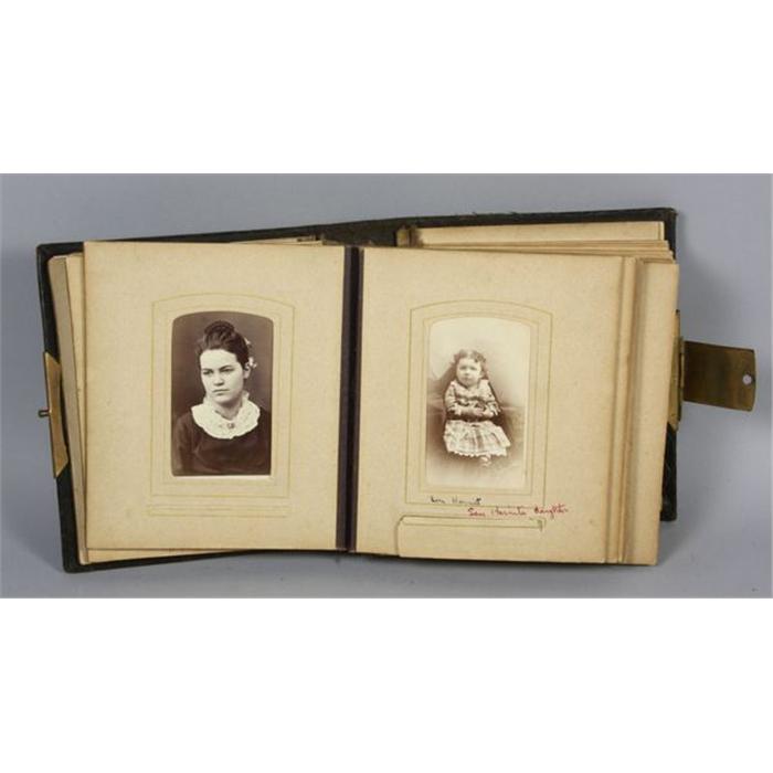 Album of forty-seven photographs, including thirty-nine (39) cartes des visites, and nine (9) tin-types, 6 1/2" x 5 1/2", some photos of Emerson and Harmit families.