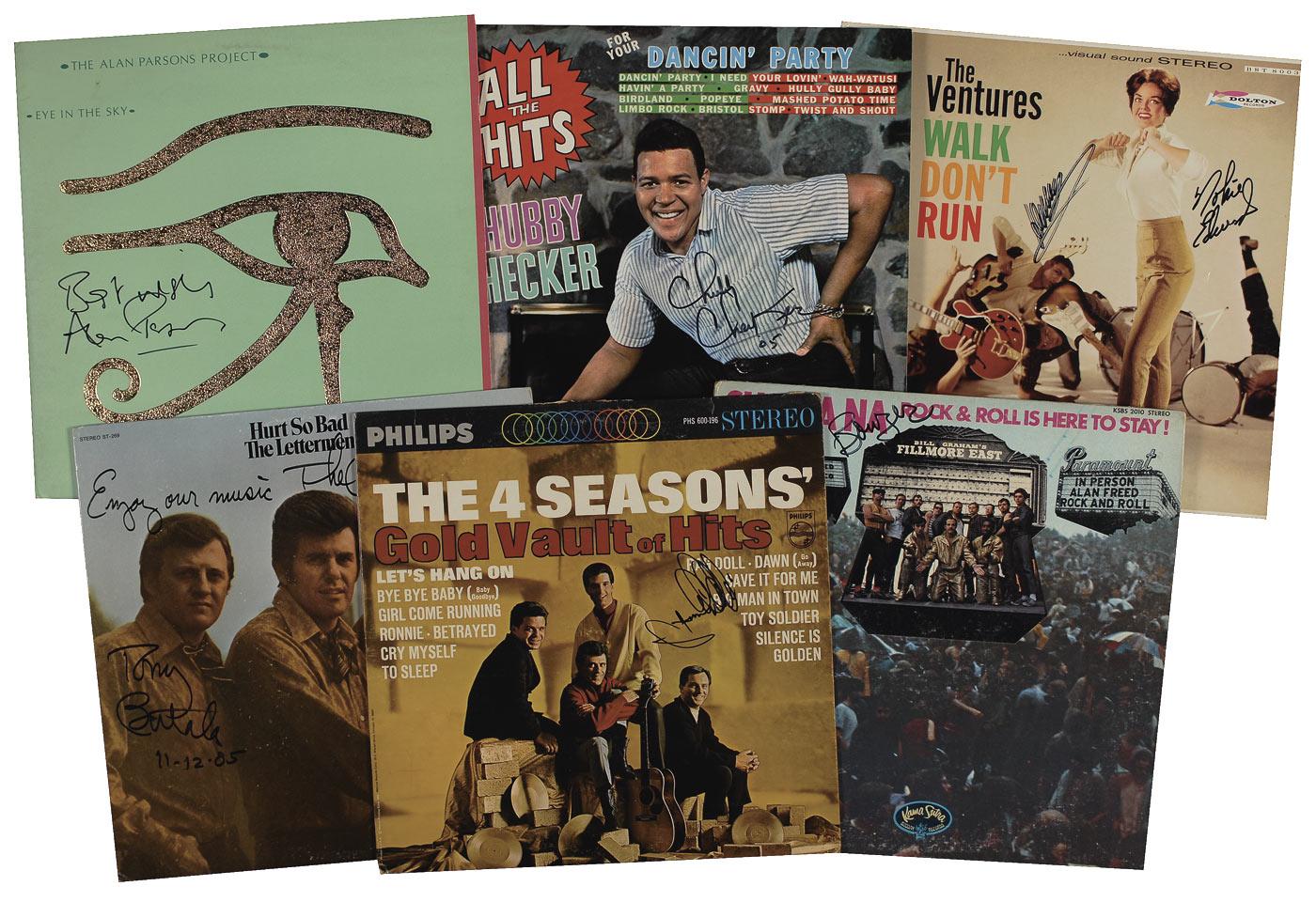 Six albums, each signed in blue or black felt tip on the cover by its respective musician(s). Signers are: Bowzer (Rock & Roll Is Here to Stay), Tony Butala (Hurt So Bad), Chubby Checker (All the Hits for You Dancin’ Party), Alan Parsons (Eye in the Sky), Frankie Valli (The 4 Seasons’ Gold Vault of Hits), and two members of The Ventures including Nokie Edwards (Walk Don’t Run). Several of the albums are included. In overall fine condition.