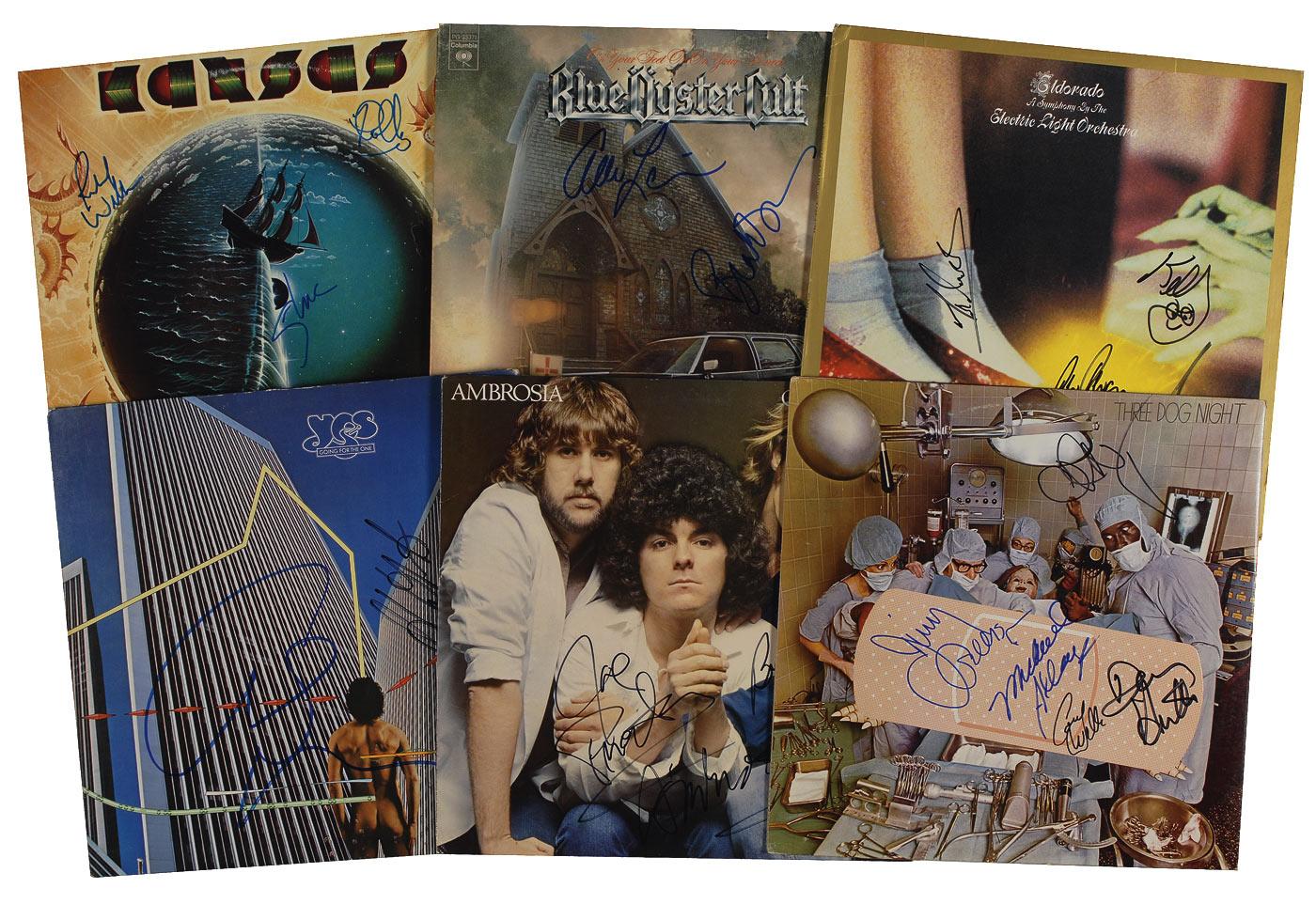 Six albums, each signed in blue or black felt tip on the cover by its respective musicians. Signers are: three members of Ambrosia (One Eighty), two members of Blue Oyster Cult (On Your Feet or On Your Knees), four members of Electric Light Orchestra (Eldorado), four members of Kansas (Point of No Return), five members of Three Dog Night (Hard Labor), and two members of Yes (Going for the One). Several of the albums are included. In overall fine condition.