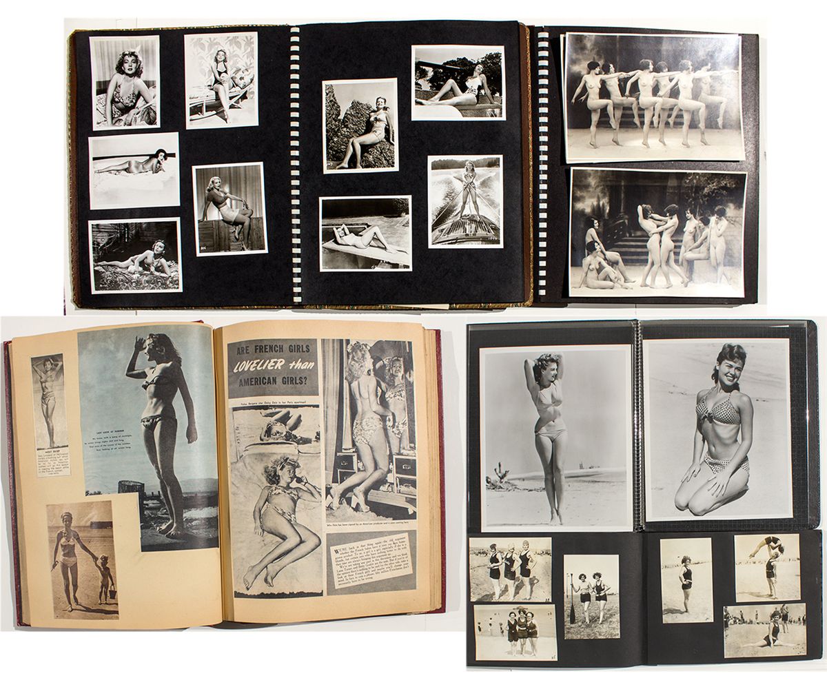 c1920 This is a lot of five albums containing photographs, in both black and white and color, showing a bevy of bathing beauties and pin-up hopefuls. These date from around the 1920's up to the 1950's. Be warned that one of the five albums contains several nude photographs. Another contains several 1920 beach shots. This is a wide and varied lot, as photos go and should enhance any photo art collection. - HKA#65994