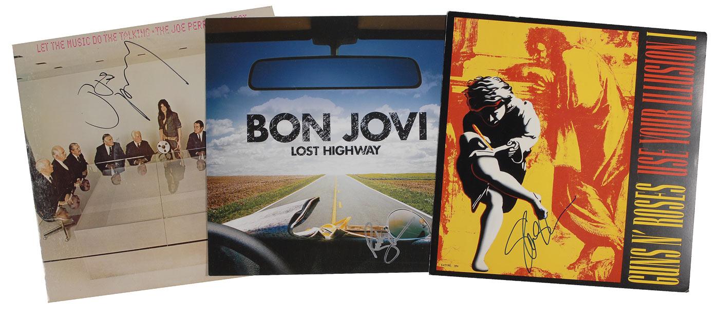 Three items: Let the Music Do the Talking signed in black felt tip by Joe Perry of The Joe Perry Project; Lost Highway flat signed in silver ink by Richie Sambora of Bon Jovi; and Use Your Illusion flat signed in blue felt tip by Slash of Guns N’ Roses. In overall fine condition. The album are included.