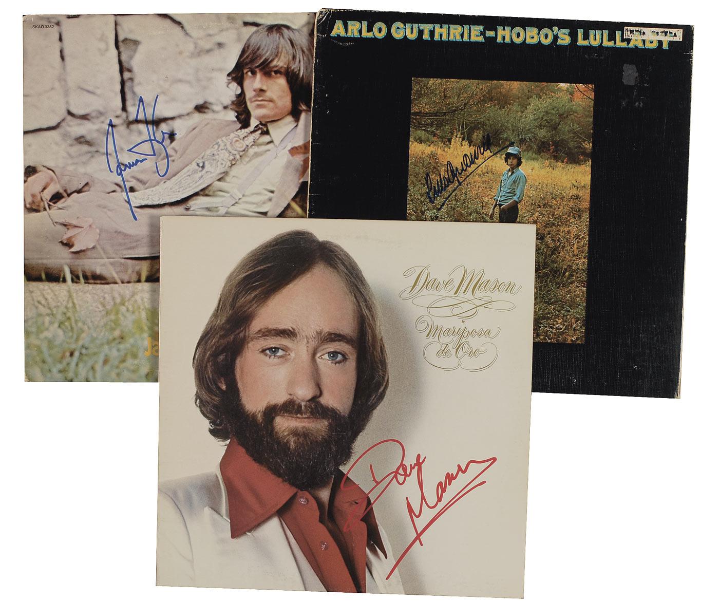 Three albums: James Taylor signed in blue felt tip by Taylor, Hobo’s Lullaby signed in blue felt tip by Arlo Guthrie, and Mariposa de Oro signed in red ink by Dave Mason. In overall very good to fine condition with creasing, scuffing, and scattering soiling with marker covering an area of missing paper on Guthrie’s album. The albums are included.