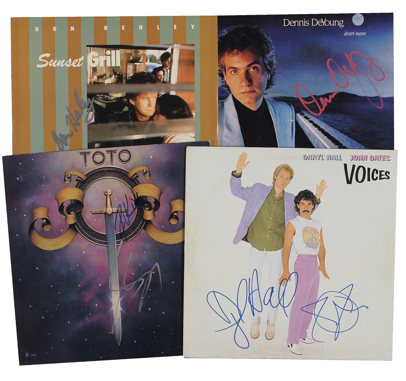 Four albums: Desert Moon signed in red ink by Dennis DeYoung, Sunset Grill 12-inch single signed in silver ink by Don Henley, Toto signed ink and felt tip by two members of Toto, and Voices signed in blue felt tip by Daryl Hall and John Oates. In overall very good to fine condition with scattered soiling and a ring of wear to the Voices album. The albums are included.