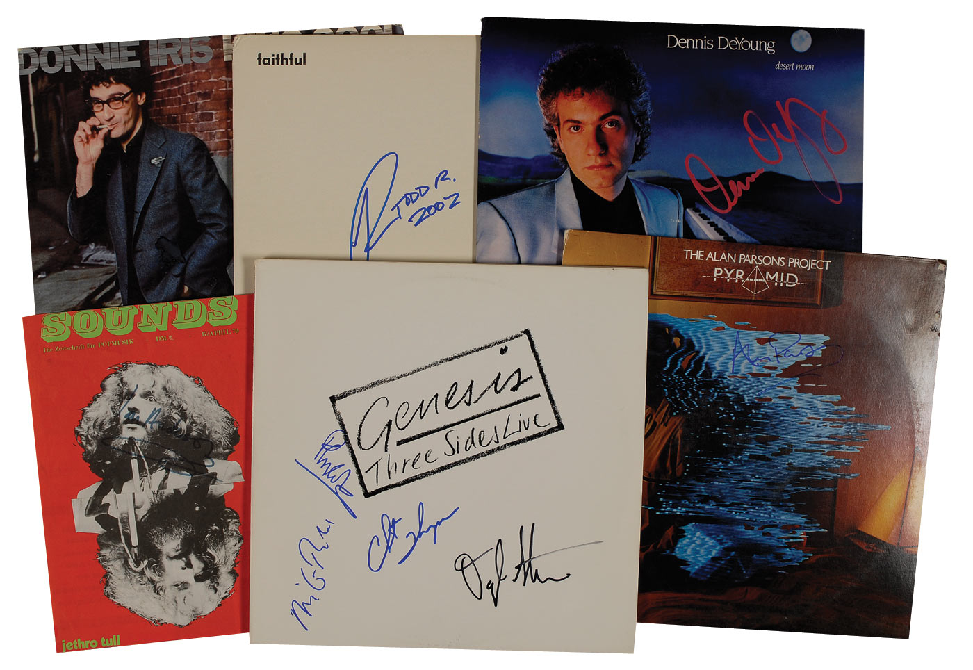 Six items: five signed albums: Desert Moon signed in red ink by Dennis DeYoung, Faithful signed in blue felt tip by Todd Rundgren, King Cool signed in blue felt tip by Donny Iris,It Is, and Three Sides Live, signed in blue and black felt tip by Phil Collins, Mike Rutherford, Chester Thompson, and Daryl Stuermer; and Sounds magazine cover from April 17, 1970, signed in blue felt tip by Ian Anderson. In fine overall condition. The records are included.