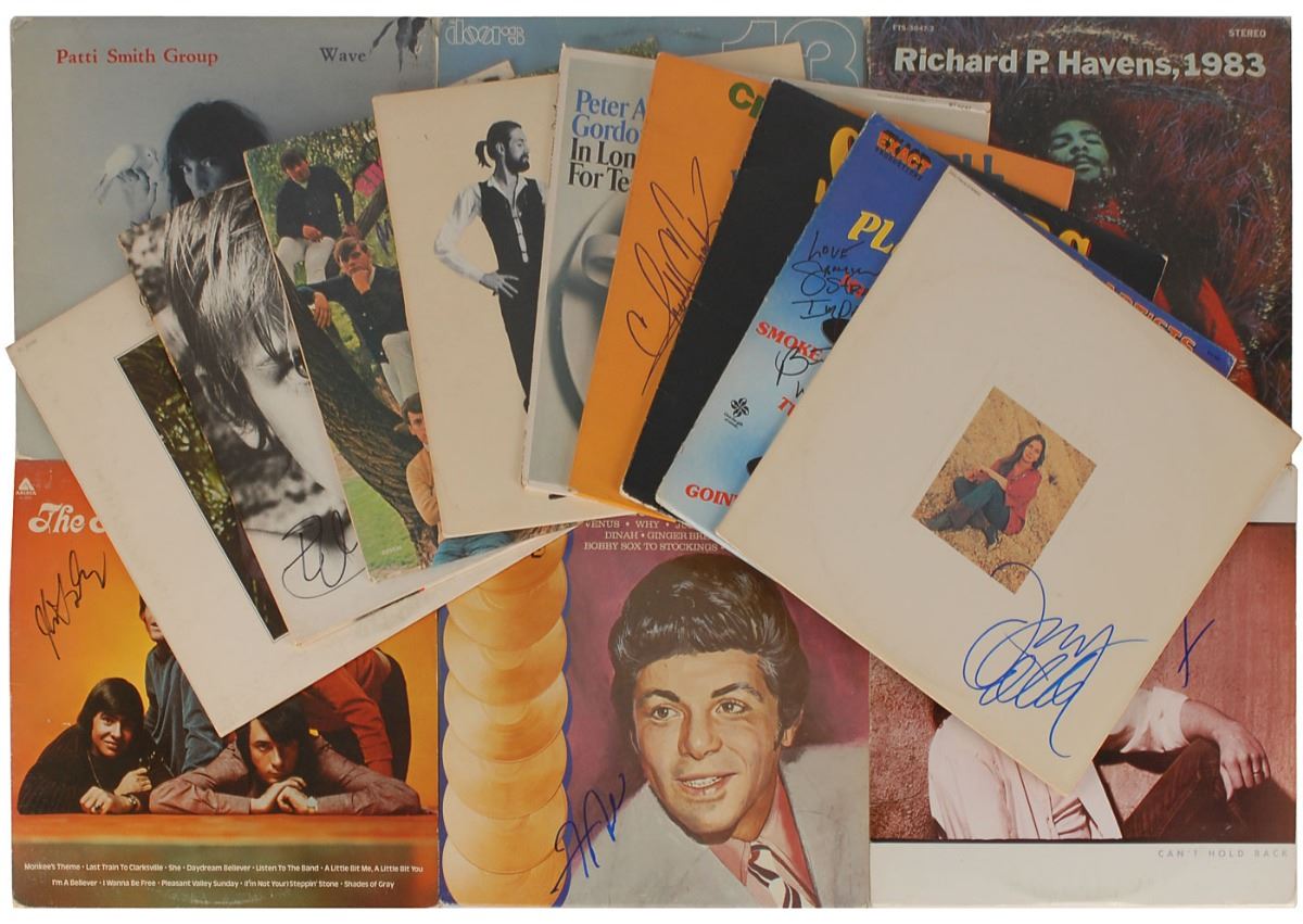 Collection of fifteen albums signed in ink or felt tip by the artist, including: Patti Smith, The Doors (Robbie Krieger and Ray Manzarek), Richie Havens (ins), The Monkees (Peter Tork and Micky Dolenz), Frankie Avalon, Judy Collins, Eddie Money, Dave Mason, U2 (Edge), Tommy James and Mike Vale, Mick Fleetwood, Peter Asher and Gordon Waller (ins), Chubby Checker and Bobby Rydell, The Strawbs (David Cousins, Chas Crink, and Dave Lambert), and Little Anthony and the Imperials (Little Anthony Gourdine, Sammy Strain, Nate Rogers, Clarence Collins, Harold Jenkins, and Ernest Wright). In overall very good condition.