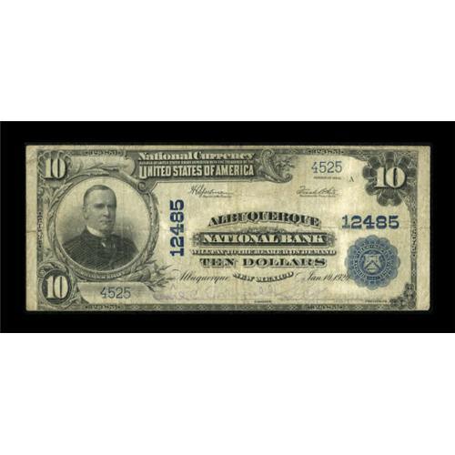 <B>Albuquerque, NM</B></I> - $10 1902 Plain Back Fr. 635 <B>Albuquerque NB</B></I> Ch. # 12485<BR> This piece saw much use in the Western channels of commerce. The paper is solid save for a couple of edge splits. The signatures, though weak, are present. <B>Very Good-Fine.</B></I><BR><I>From The Kansas City Collection.</B></I><BR><BR><b>Shipping:</b> Coins & Currency (<a target="_blank" href="http://www.heritageauctions.com/common/shipping.php">view shipping information</a>)