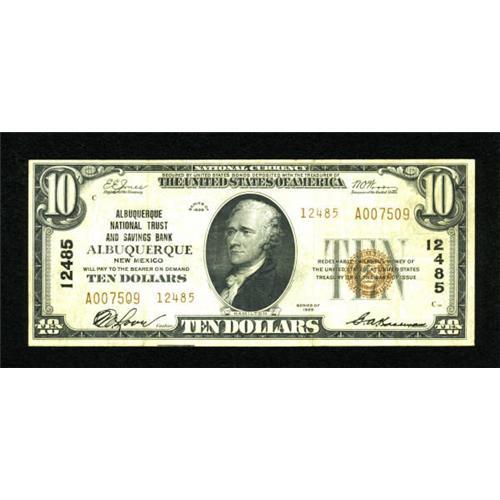 <B>Albuquerque, NM</B></I> - $10 1929 Ty. 2 <B>Albuquerque National Trust & Savings Bank</B></I> Ch. # 12485<BR> This is a perfectly matched note to the $5 issue offered in the lot above. <B>Very Fine.</B></I><BR><BR><b>Shipping:</b> Coins & Currency (<a target="_blank" href="http://www.heritageauctions.com/common/shipping.php">view shipping information</a>)