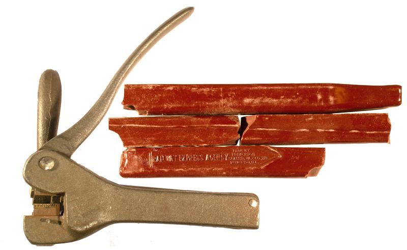 Original lead sealer for sealing coin bags and other goods from the Railway Express. This piece is marked from railway Express, "Albuqu to Los Ang." Also included are two original boxes of wax used for the Wells Fargo wax seals.