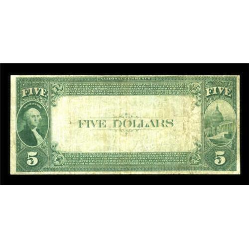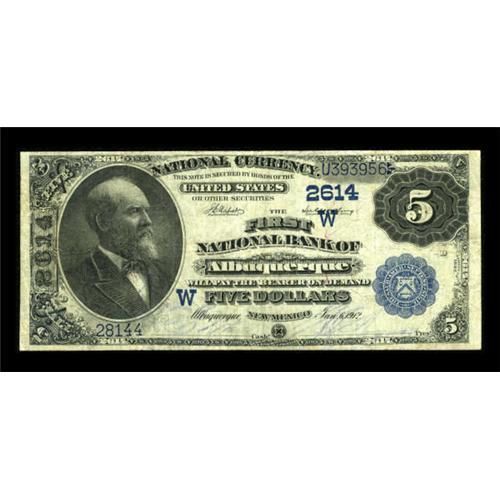 <B>Albuquerque, NM</B></I> - $5 1882 Value Back Fr. 575a <B>The First NB</B></I> Ch. # (W)2614<BR> A rare and undervalued type and denomination from New Mexico, with the total population from all banks combined standing at just eleven pieces, eight of which are from Albuquerque. All are low grade, with this example as nice or nicer than any of the others reported to date. <B>Fine, </B></I>with good color and margins for this issue. <BR><BR><b>Shipping:</b> Coins & Currency (<a target="_blank" href="http://www.heritageauctions.com/common/shipping.php">view shipping information</a>)