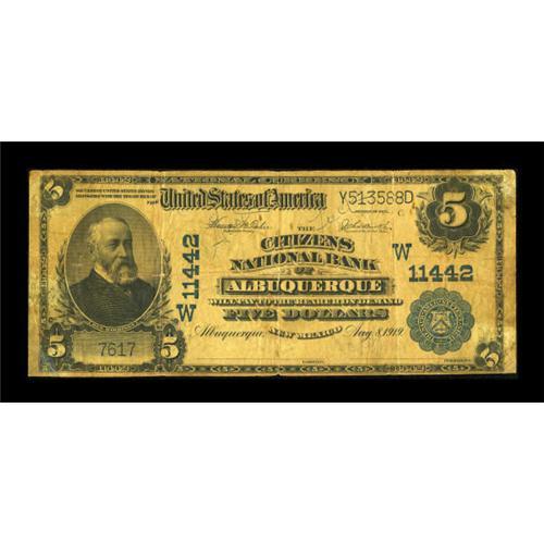 <B>Albuquerque, NM</B></I> - $5 1902 Plain Back Fr. 606 <B>The Citizens NB</B></I> Ch. # (W)11442<BR> This is an exceedingly scarce bank with only about a half dozen notes known. Though heavily toned, the note faces up well. There are some splits at the folds and two repaired corners, but all of the restorations were professionally executed. <B>Fine.</B></I><BR><BR><b>Shipping:</b> Coins & Currency (<a target="_blank" href="http://www.heritageauctions.com/common/shipping.php">view shipping information</a>)
