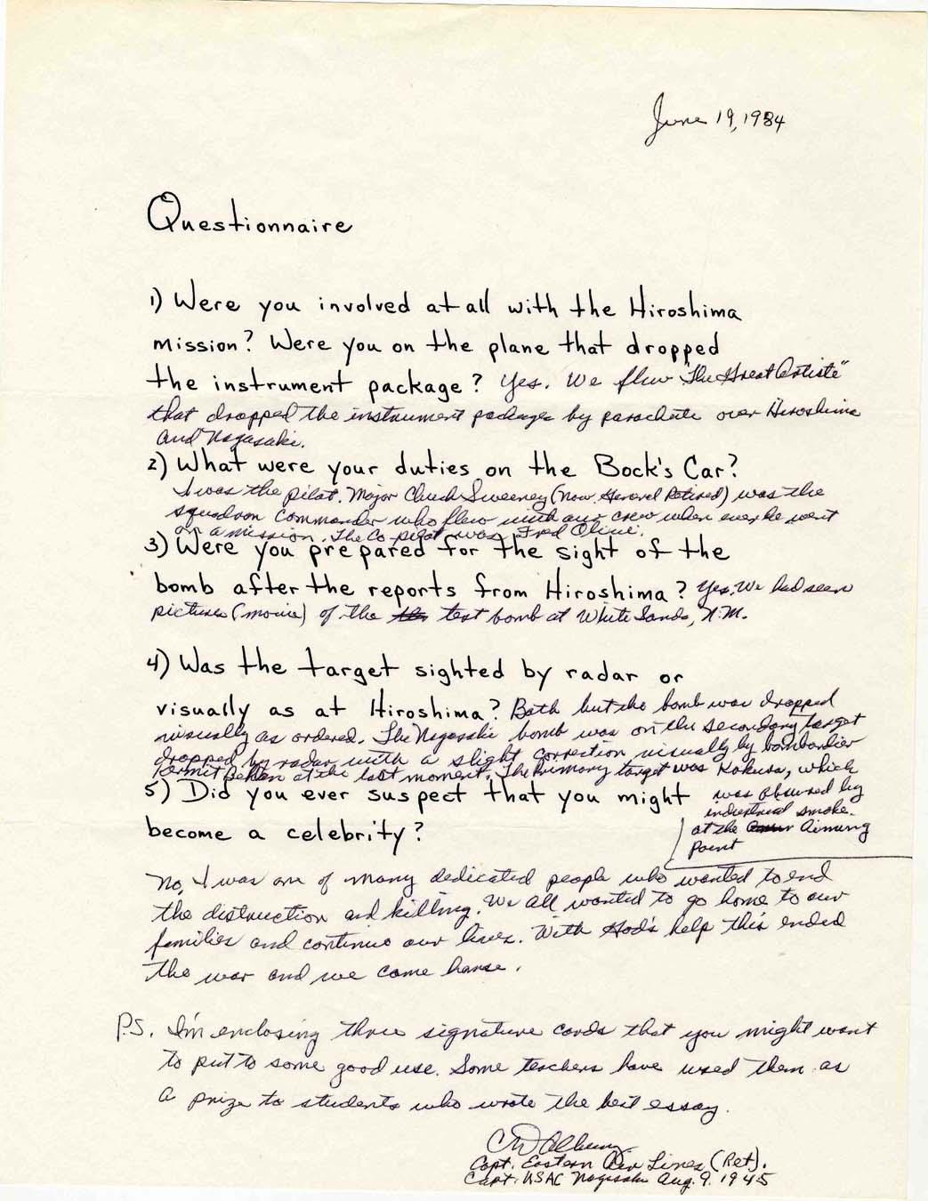 Charles Albury, Bockscar copilot, signed and handwritten responses to a questionnaire, dated 19 June 1984. Albury writes, ''…We flew ''The Great Artiste'' that dropped the instrument package by parachute over Hiroshima and Nagasaki…We had seen movies of the test bomb at White Sands, N.M…I was one of many dedicated people who wanted to end the destruction and killing. We all wanted to go home to our families…With God's help this ended the war…C.D. Albury''. Single page questionnaire measures 8.5'' x 11'' and is in fine condition.
