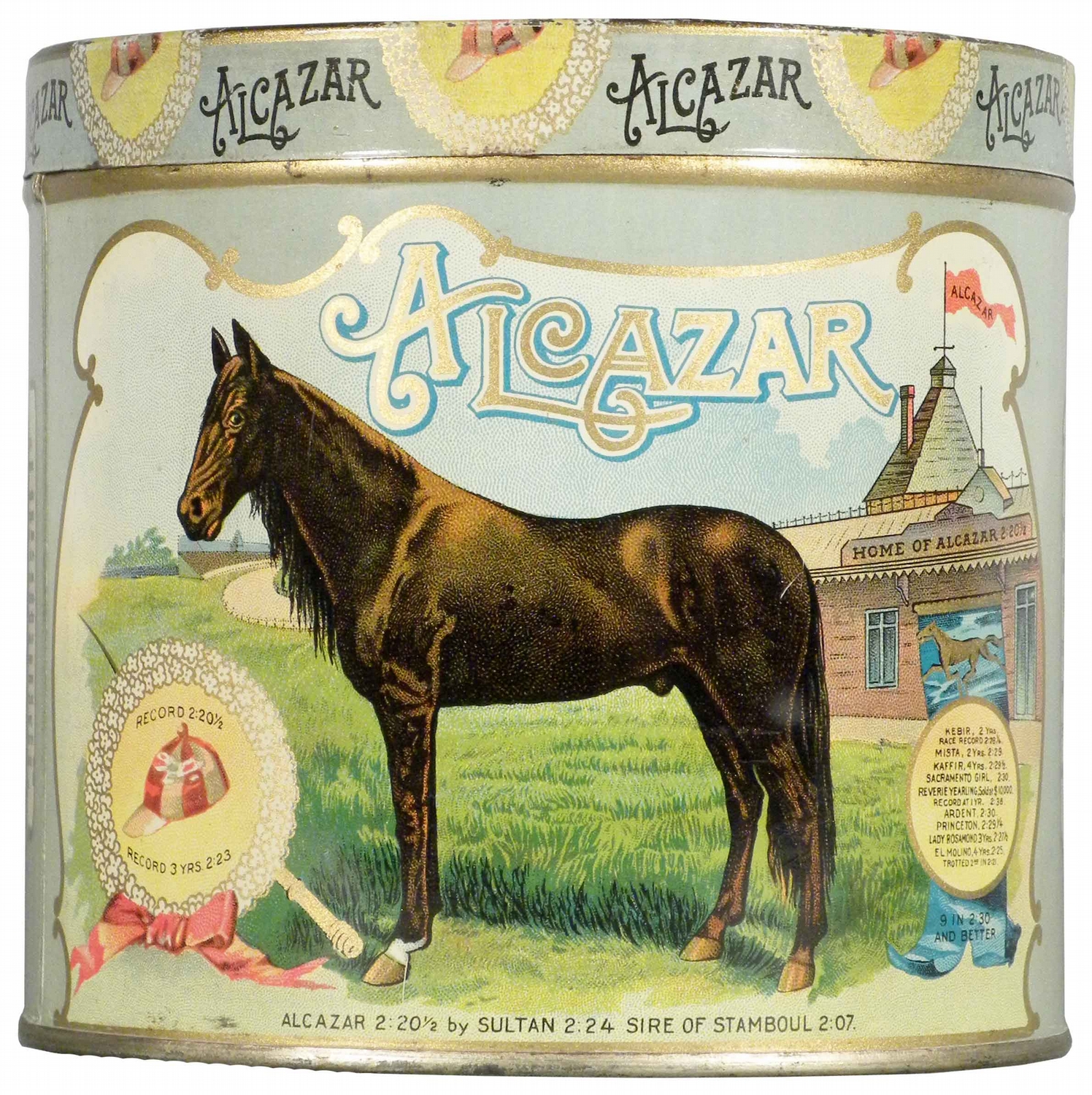 Alcazar Cigar Tin. This is undoubtly one of the most appealing colorful Cigar Tins ever produced. Made by the Liberty Can Co. who were known for their 12 color graphics and their Stone lithography process. No other can company used such elaborate litho production. The condition does not get any better. 50 Cigars. Mint condition.