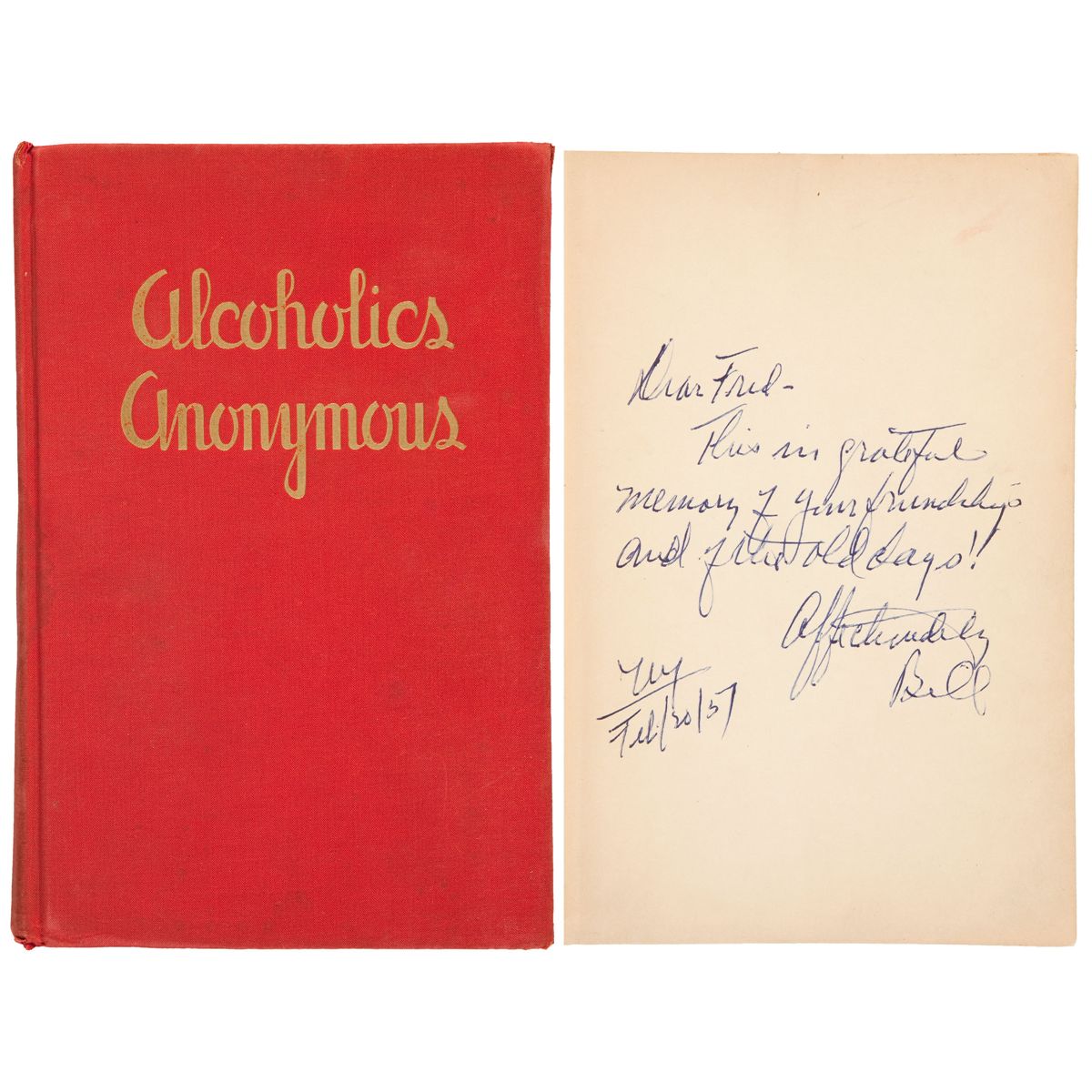 First edition, first printing of ''Alcoholics Anonymous'' hardcover book, signed and inscribed by AA co-founder Bill Wilson on the front free endpaper. Works Publishing Inc: New York: 1939. Wilson inscribes this copy in blue ink, ''To Fred - This in grateful memory of your friendship and of the old days! Affectionately / Bill / NY / Feb/20/51 [or 57]''. In original publisher's red cloth boards with titles in gilt lettering. Housed in a complementing red cloth clamshell case with black leather labels titled in gilt. Book has some wear to boards, with a circular dampstain on spine. Minor toning and and wear to edges of interior pages. Very good condition overall.