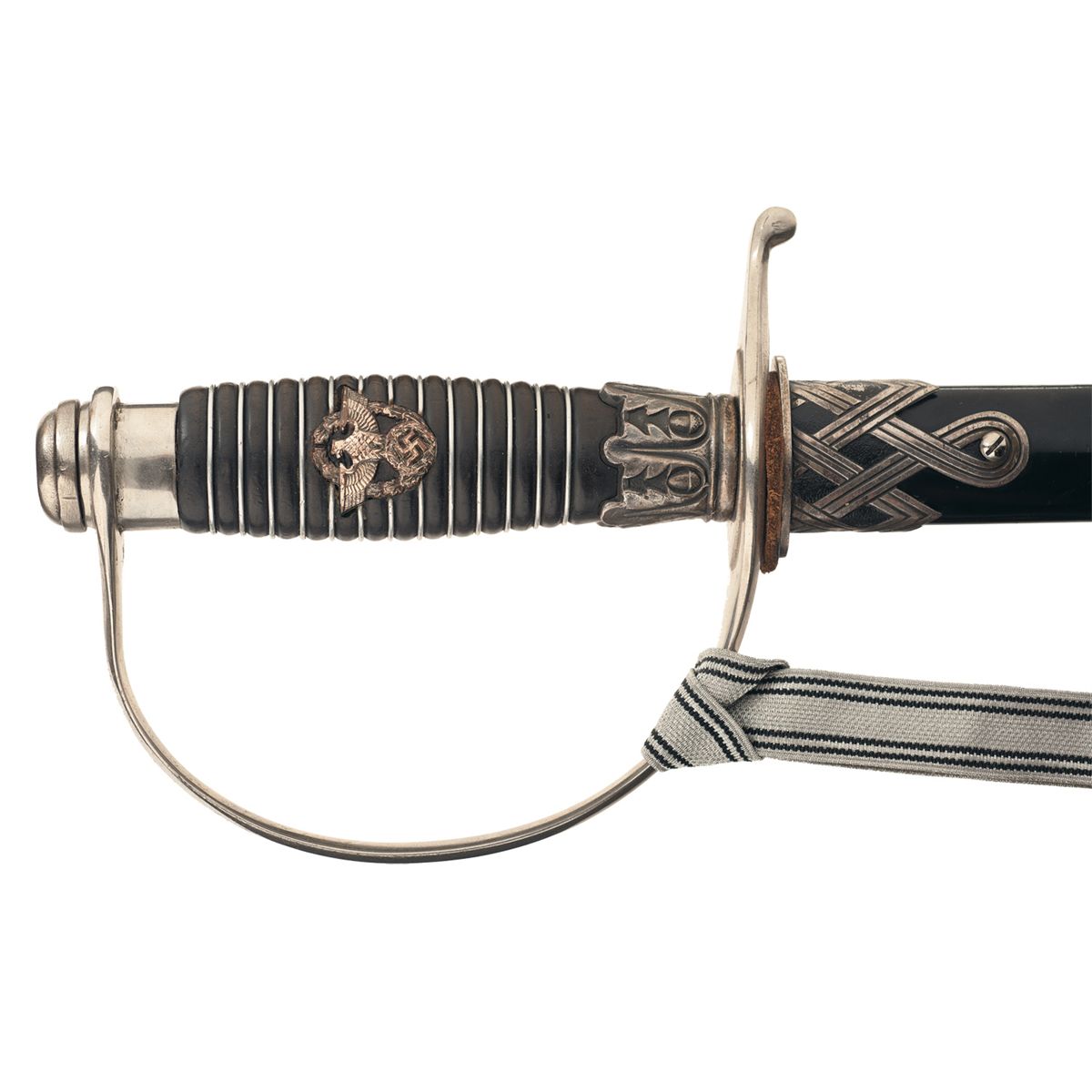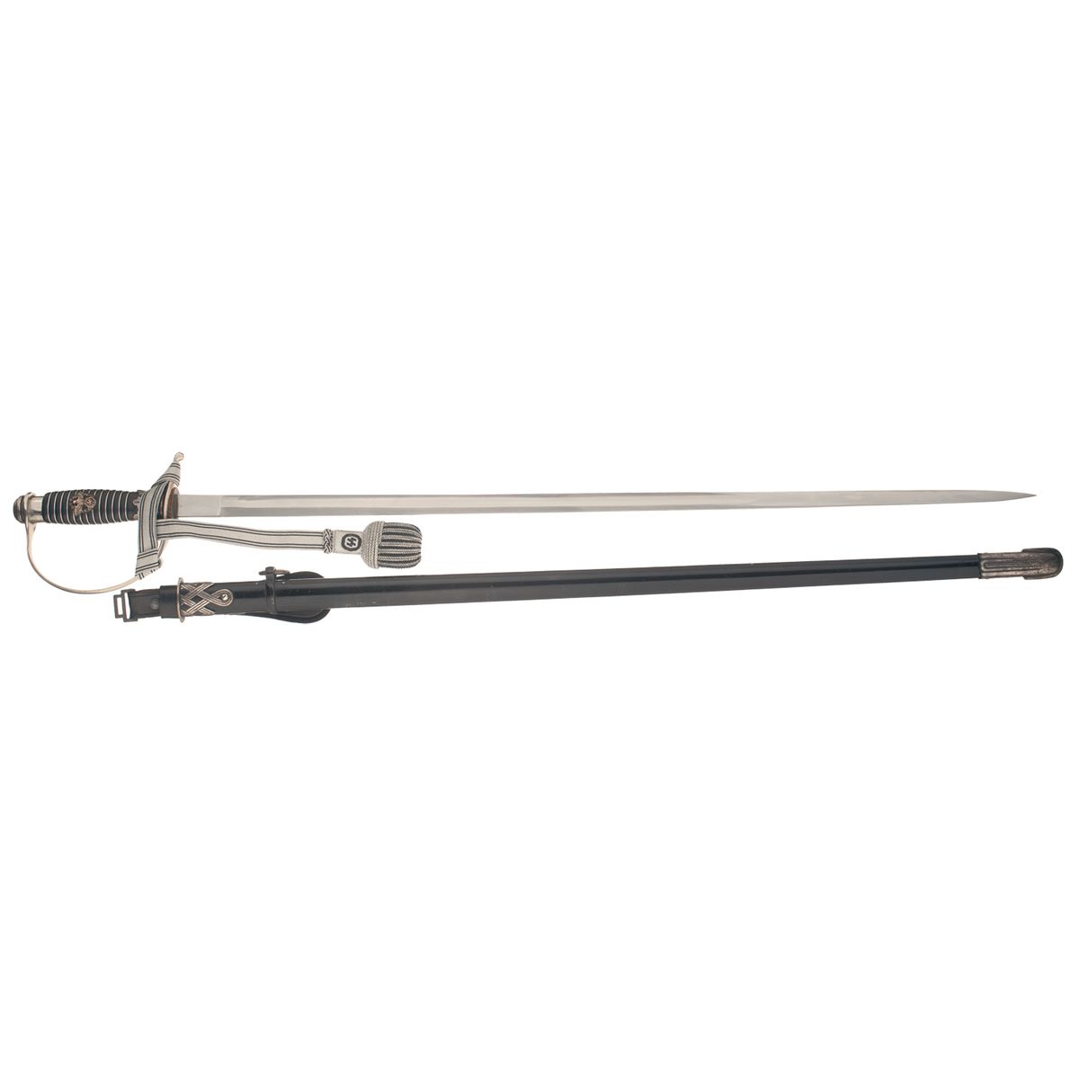 29 1/2 inch single fuller blade, with the Alcoso (Solingen) logo on the left ricasso. Nickel finished hilt, with the wreathed police eagle on the right side of the wire wrapped hard rubber grip and SS runes on the pommel cap. With a black and silver portapee with SS runes on the solid acorn, black enamel finished sheath with aged silver throat and tip, and a leather hanger.