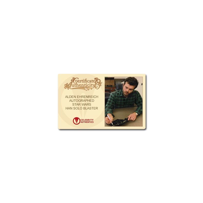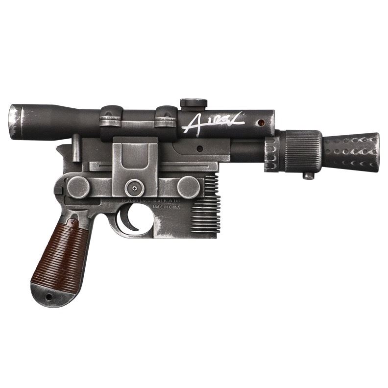 This Star Wars Han Solo Blaster has been personally hand-signed by the new, reigning Han Solo himself, Alden Ehrenreich during his only autograph signing to date. This Star Wars Han Solo DL44 Blaster is a 1:1 scale full size piece and replicates the famous hand held weapon wielded by the sky pirate. Blaster started as a Rubies replica prop and was completely refinished, sanded, and has multiple coats of paint along with being weighted to match a stunt pistol. This prop was then custom painted, weathered, clear coated as well as having extra additional pieces added to give it a more accurate and realistic finish. This extraordinary display piece ships with Alden Ehrenreich Authenticated Hologram affixed under the Blaster and Celebrity Authentics serial-numbered and tamper evident Authentication Hologram affixed on back. Includes Celebrity Authentics Certificate of Authenticity featuring picture of Alden signing. Stock image used for product images. Item ships with clean, unsmudged autograph in similar location. Be ready for your next galaxy raid with this extraordinary piece!